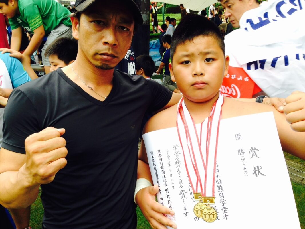 相撲を始めた小学生の頃の写真(左 川副の父竜次さん、右 川副)※本人提供