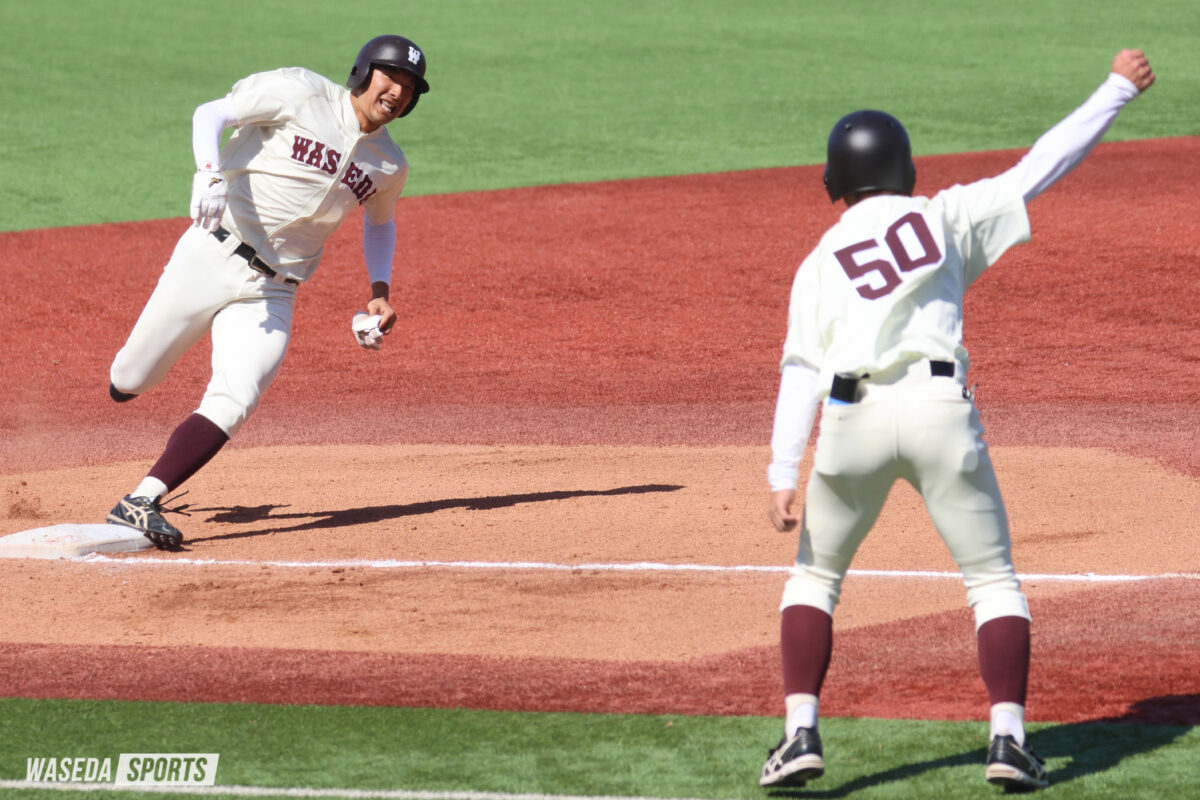 その中で中島稜太(人4=東京・桐朋)、畑﨑一颯(商4=埼玉・早大本庄)という同じ学生コーチの存在は大きかった。2人は選手との距離が近いからこそ見える意見を共有した。「勝ちに向かっていけるチームができたのは彼らの協力のおかげ」と大西。新人監督という重圧の中で、仲間に支えられていた。