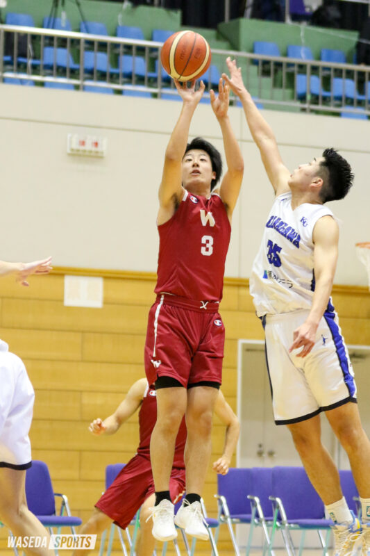 そしてインカレでも早大は勝ち進み、迎えた白鷗大との決勝戦。試合は相手の高さに苦しみ、中盤から劣勢の展開となる。徐々にリードを広げられ、第3Qには11点のビハインドを背負った。それでも、この流れを変えたのが高田和幸。第3Q残り約5分から、奇跡の2分間が始まった。