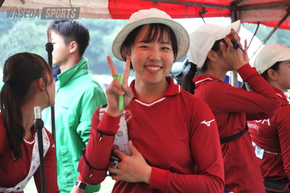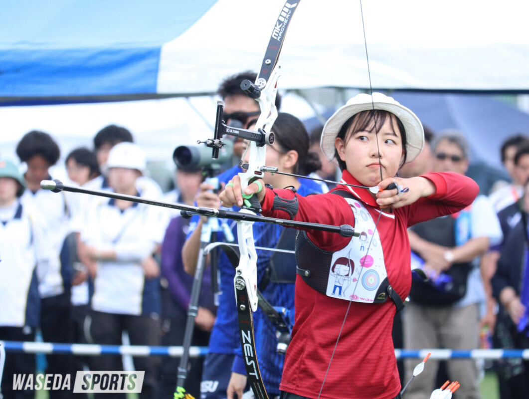 早稲田大学に入学した理由は、スポーツに関するハイレベルな知識を授業で学び、競技に活かせる点に魅力を感じたこと。そして、エリートアカデミー時代から尊敬していた園田稚(令7スポ卒)が活躍しており、背中を追うかたちで進学を決めた。入学当初のアーチェリー部のイメージとして、コーチに一方的に指導されるのではなく、「完全に学生主体で動くことが新鮮で刺激的だった」と振り返る。渋谷は入学してすぐ王座のメンバーに選ばれたものの、調子が悪く自信はなかった。しかし、「早稲田の応援の雰囲気とか、全員で戦っている感覚があって、自信はないけど楽しい試合だった」そうだ。早大アーチェリー部の強みである一丸となった応援に魅了されていた。しかし、その後は「的前に立っても良いイメージが湧かない、怖い」と思うほどの大スランプに陥る。「自分のなかで悪いところが分かっていながらも、挑戦してうまくいかないと考えると怖い」として自分のなかで葛藤し、一歩踏み出せない苦しい期間が続いた。
