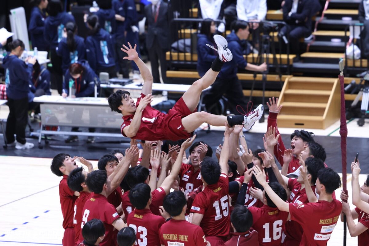 もう悔しい思いはしたくない。4年次、2年目の主将として迎えたラストイヤー。チームを間違った方向へ引っ張ってはいけない。昨年の反省から、正しい方向へ導くために同級生の力を借りる。同期は副将、主務、アナリスト、時にプレイヤーとして前田を支える。チームの結束が強まり、それは結果として結実。春季リーグ、秋季リーグを制する中で発見した課題にも取り組み、集大成の全日本インカレを迎える。盤石の試合運びでセットを失うことなく決勝まで進出する。決勝では前田の磨き続けたトスで会場が沸き、早大が躍動した。失セット0で完全優勝を達成し歓喜の渦に包まれた。優勝した前田に対して松井泰二監督(平3人卒=千葉・八千代)は「前田君は最高だ」と激励の言葉をかけた。最高のチームをつくり上げ、苦しかった4年間を笑顔で締めくくった。4年間を振り返って湧き出てくるものは周囲への感謝だ。