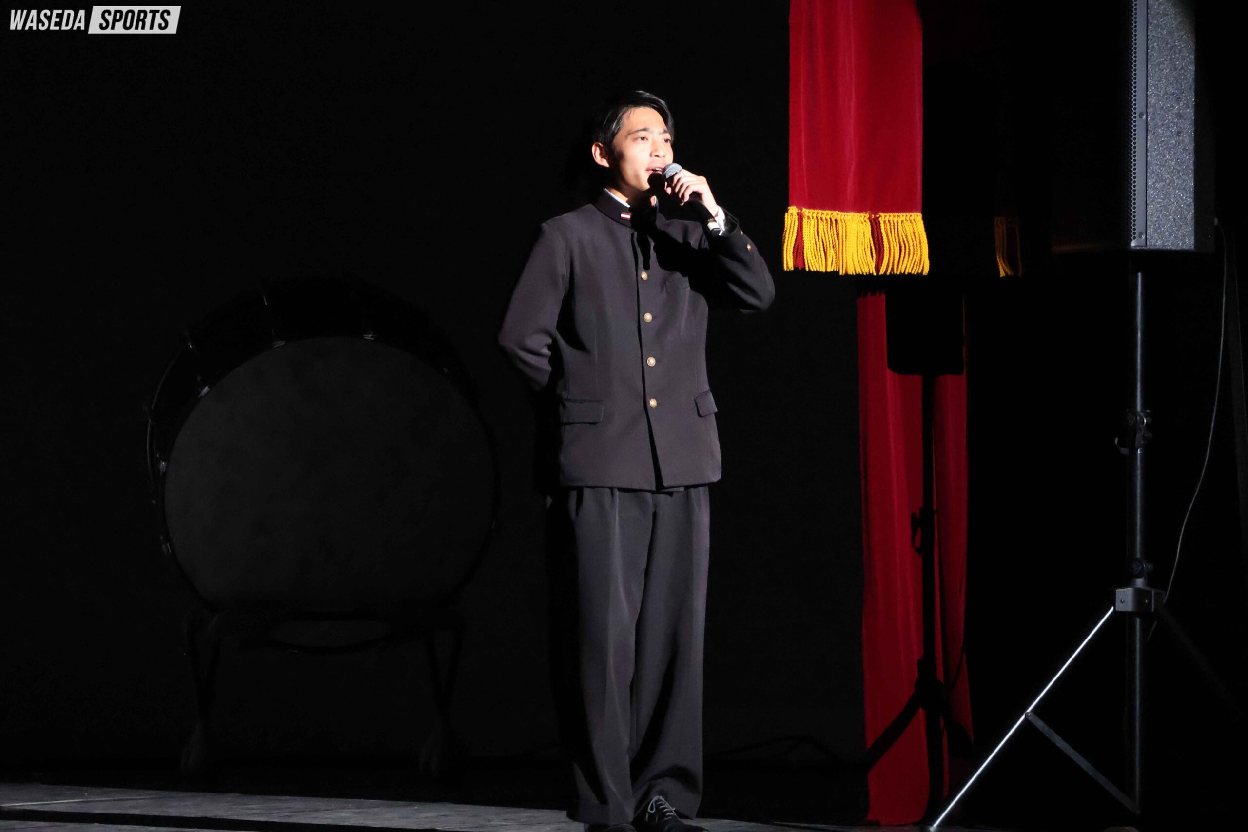 昨年の第71回早慶戦前夜祭稲穂祭での豊島主将(土橋俊介撮影)