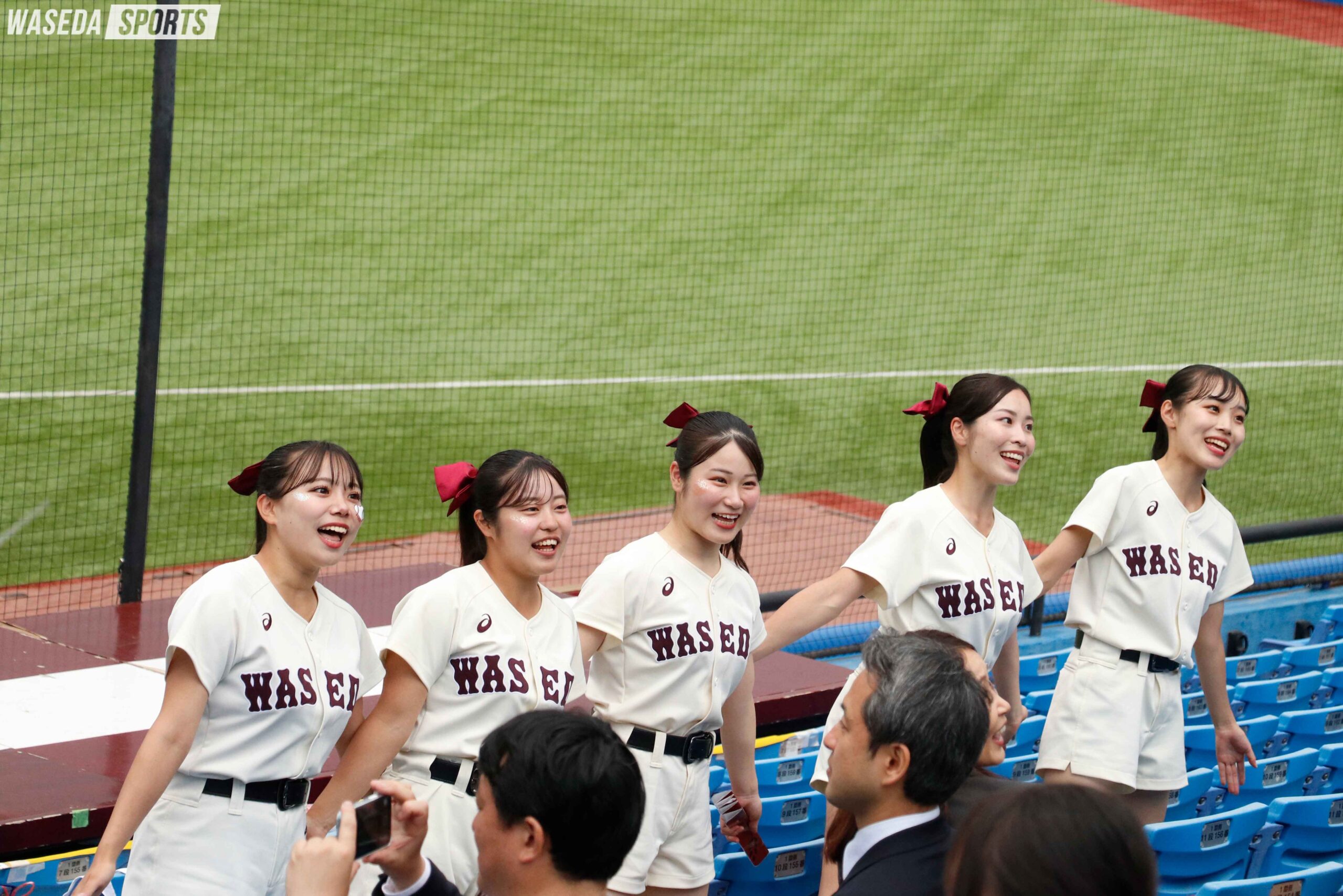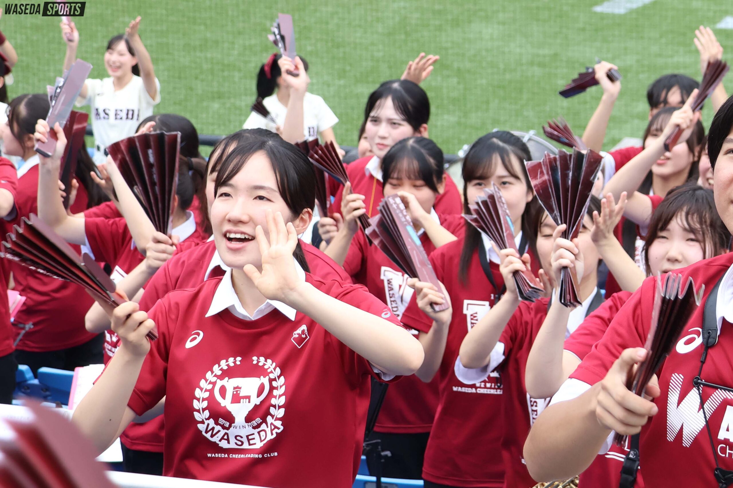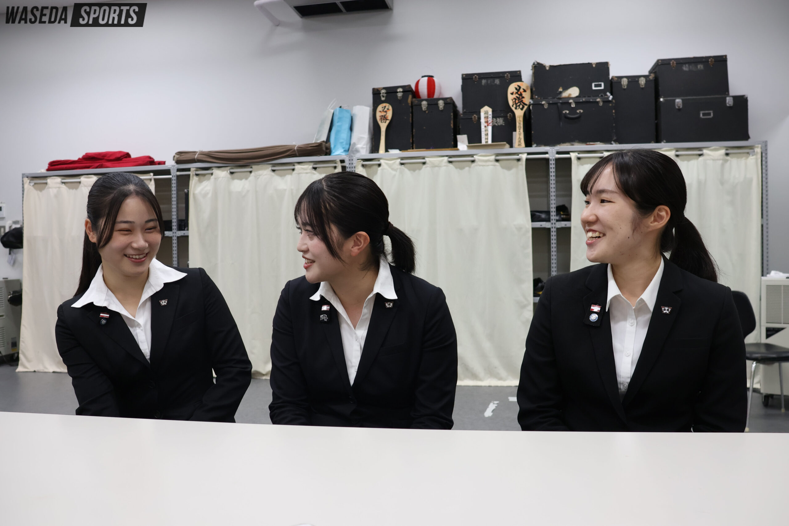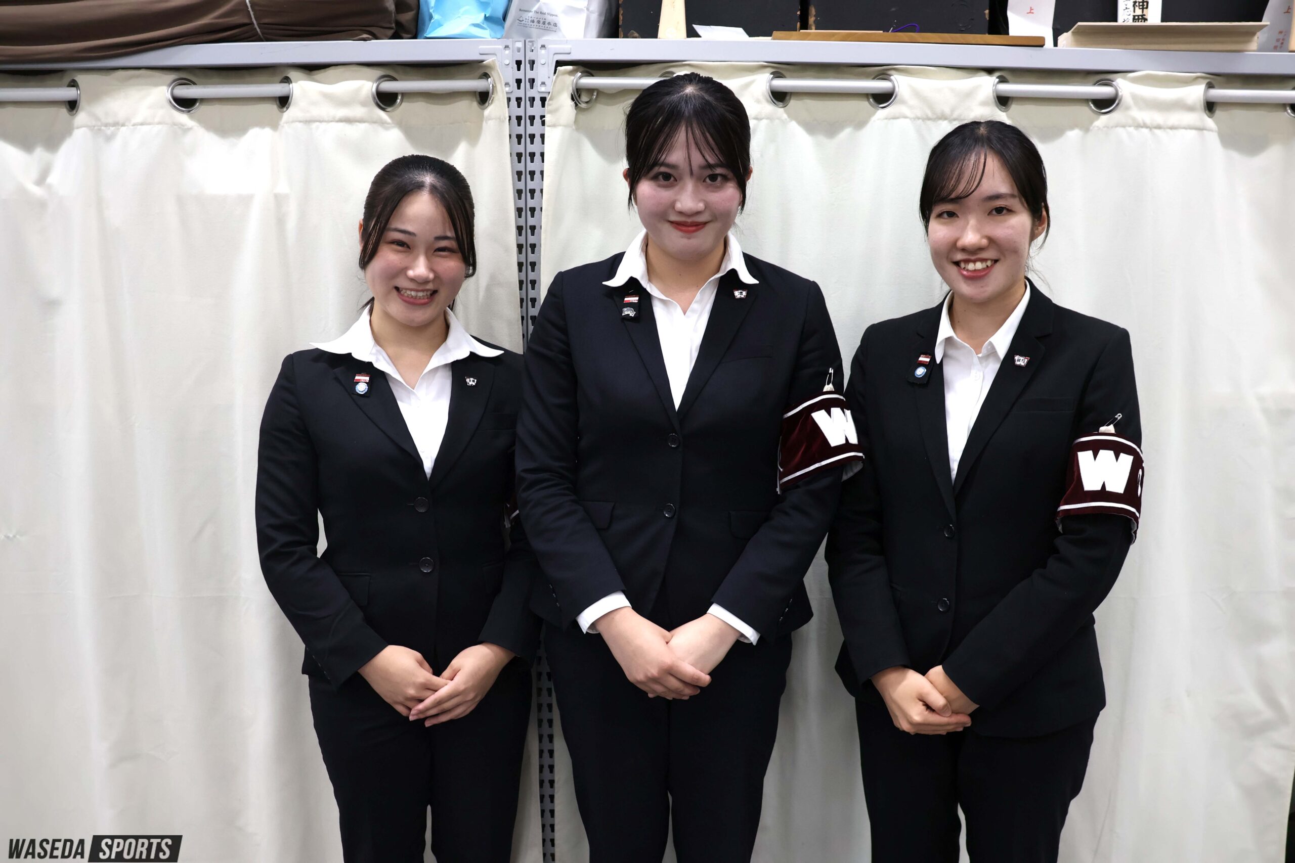 早慶戦直前特集第2回は主務部門の対談をお届け。応援部の円滑な活動のために役職を全うする白井綾乃代表委員主務(法4=埼玉・淑徳与野)、松下瑛吹奏楽団主務兼演奏会広報責任者(政経4=埼玉・早大本庄)、竹内空チアリーダーズ主務(文構4=愛知・千種)の3人にお話を伺った。