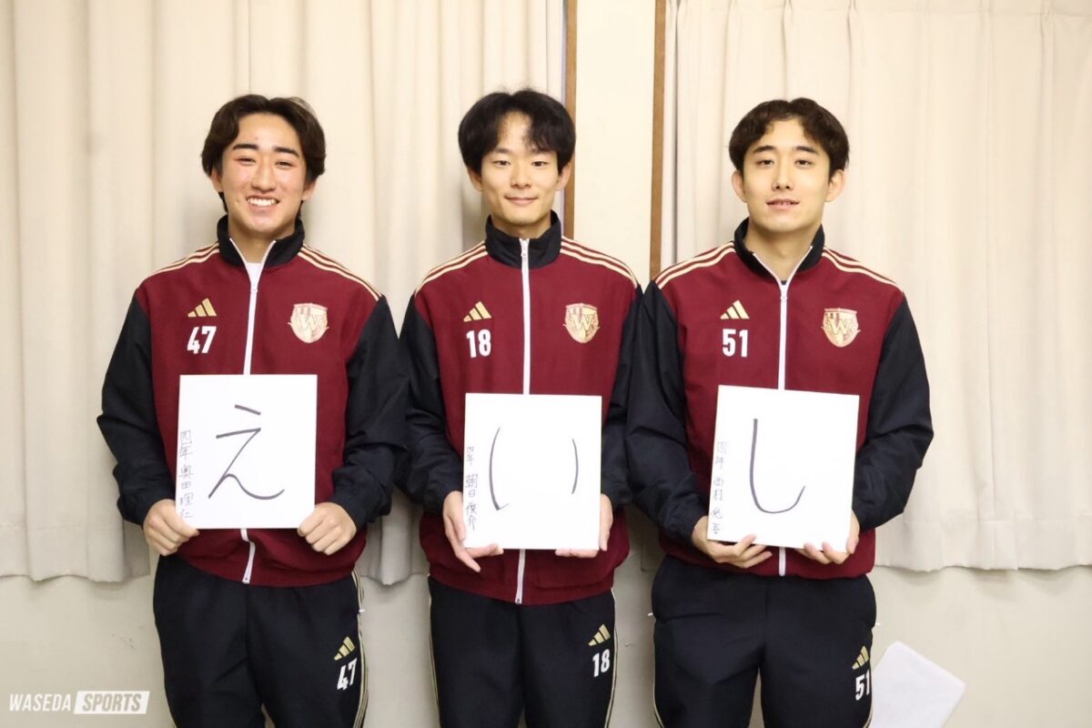 第3回は、西村悠吾副将(人4=千葉・市川)、奥田理仁(人4=群馬・富岡)、朝日俊介(創理4=東京・東邦)の4年生グループ。関東学生秋季リーグ(秋季リーグ)でのチームの成長、インカレへの意気込みを伺いました。4年生同士の関係性や、4年生から見た後輩の雰囲気、エピソードも語っていただきました!