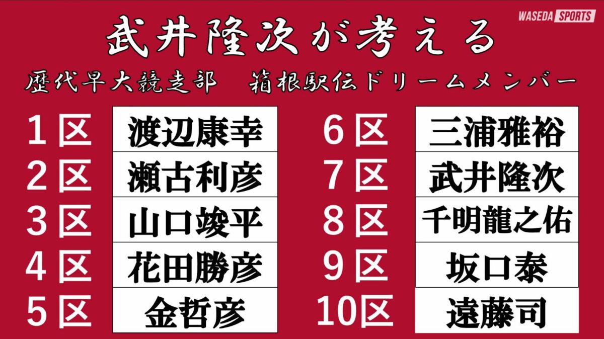 4年連続区間賞、3年連続区間新。早稲田が誇る「駅伝漢」で「三羽烏」の一角を担った武井隆次氏(平6人卒=東京・国学院久我山)。第69回東京箱根間往復大学駅伝(箱根駅伝)では7区を走り、早大を再度首位に返り咲かせ、総合優勝に大きく貢献した。当時の知られざる裏話や来年の早大への期待、そしてともに戦った盟友への思いに迫る。