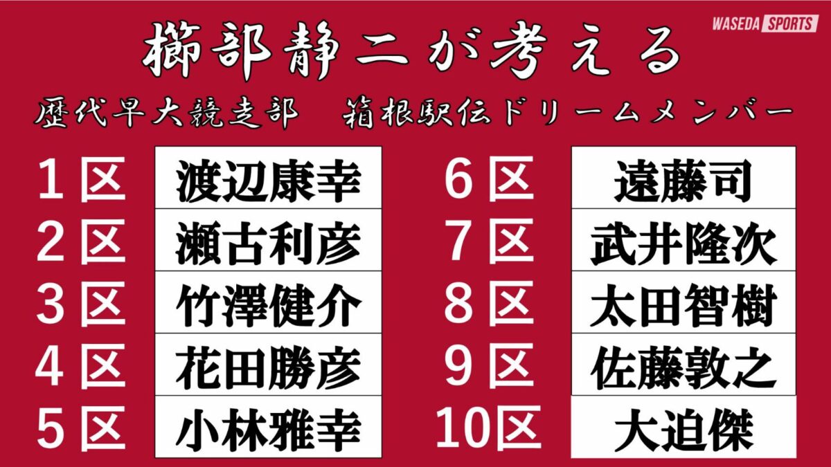 優秀な選手がたくさんいますが、今年大活躍している山口智規(駅伝主将、スポ4=福島・学法石川)くんに注目します。彼は高校時代からよく知っていて、個人的にも会ったら声をかけています。今年はすごく成長が見られて、(早大の)先輩としては喜ばしい話ですが、対するチームの監督としては、もう少しゆっくり走ってくれと思ってしまいますね(笑)。