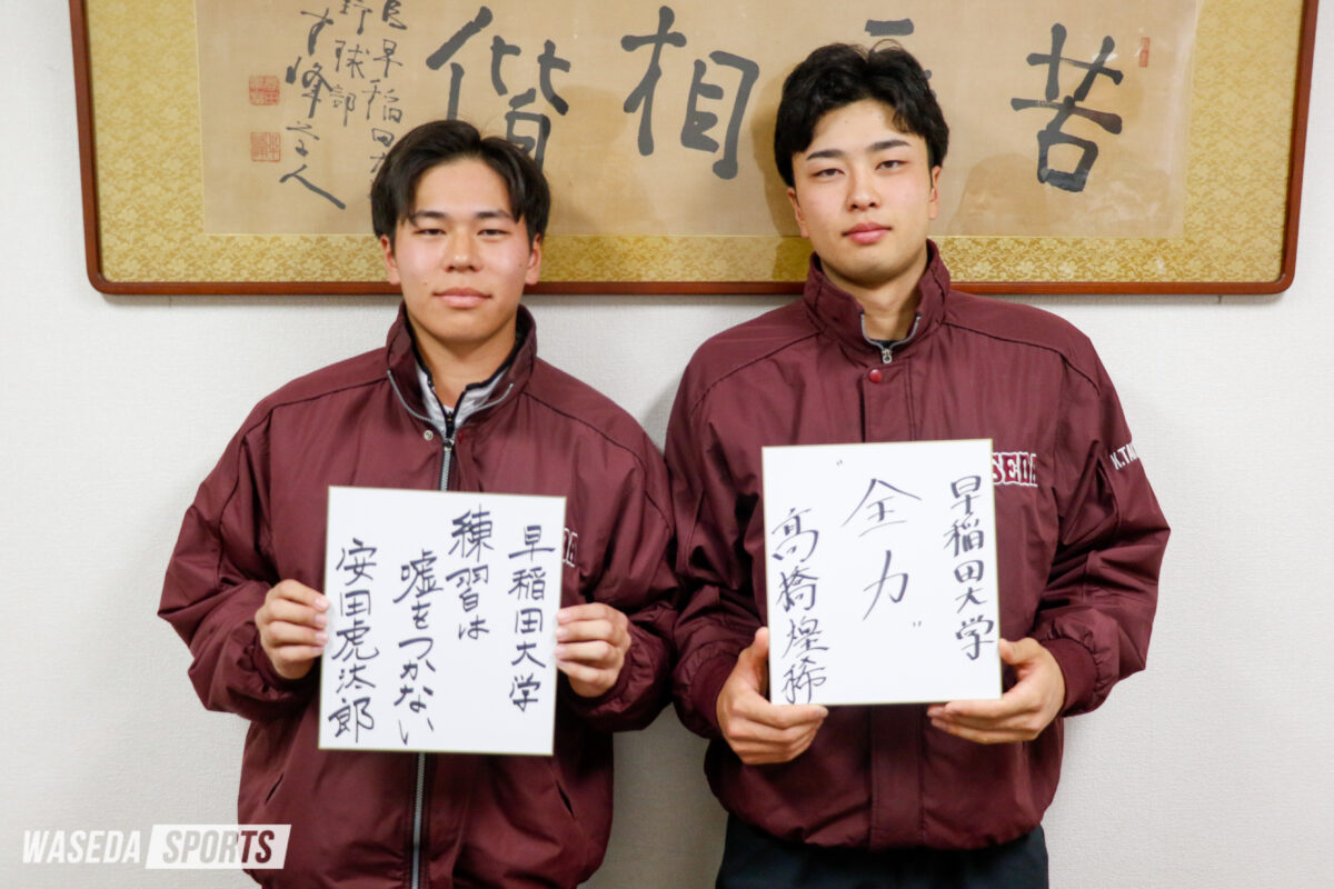 早大投手陣の一翼を担う髙橋煌稀(スポ2=宮城・仙台育英) と安田虎汰郎(スポ2=東京・日大三)。さらなる飛躍を期待される同期コンビに新体制での意気込みを伺った。