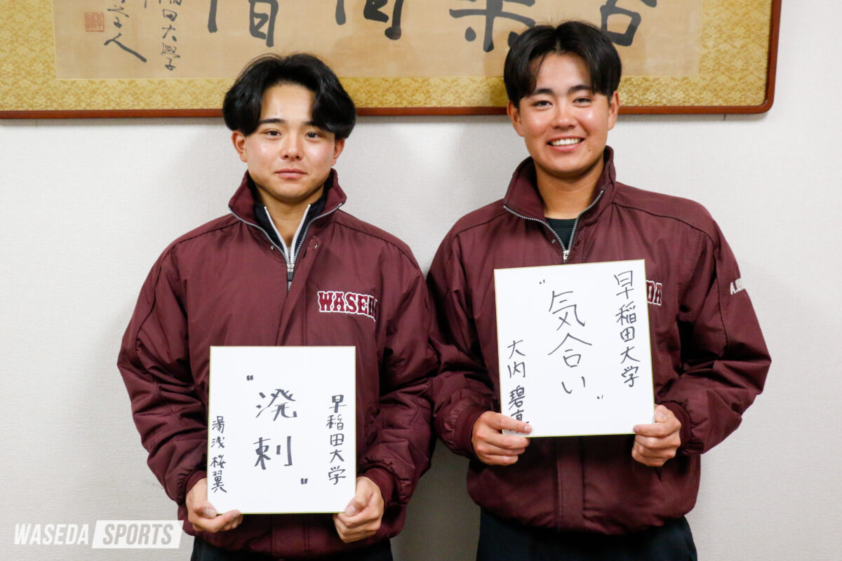 第1回に登場するのは、昨年遊撃で出場経験のある大内碧真(スポ3=埼玉・浦和学院)と、1年生ながらAチームに帯同した湯浅桜翼(スポ1=仙台育英)。二遊間を組むことが予想される2選手に、新体制の意気込みを伺った。