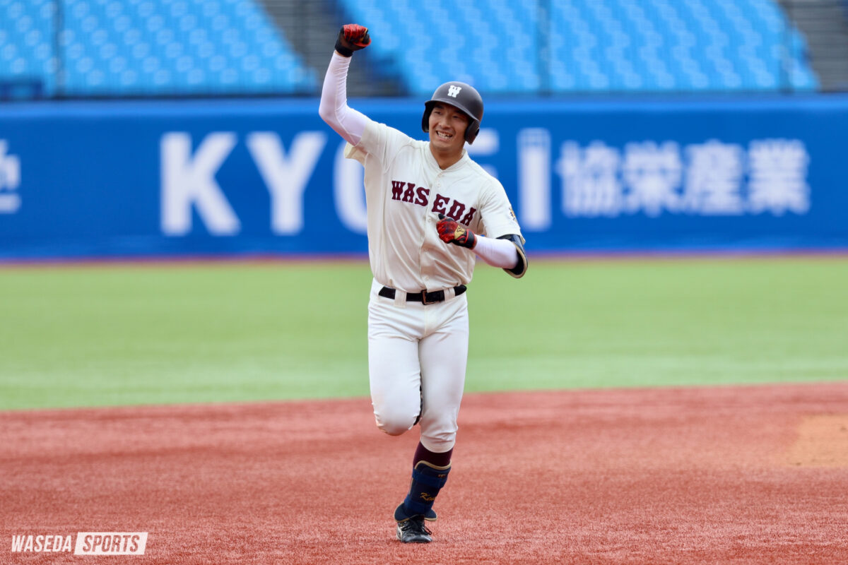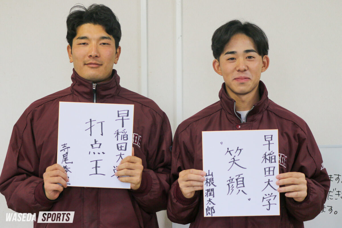 寺尾 高校時代は、「キャプテン(である自分)が一番(練習を)やらないといけない」という思いでやっていました。その経験を生かしたいと思っています。香西(香西一希主将、スポ3=福岡・九州国際大付)はピッチャーなので(野手である山根とともに)3人でチームを支えていければと思っています。