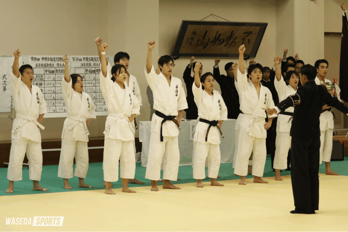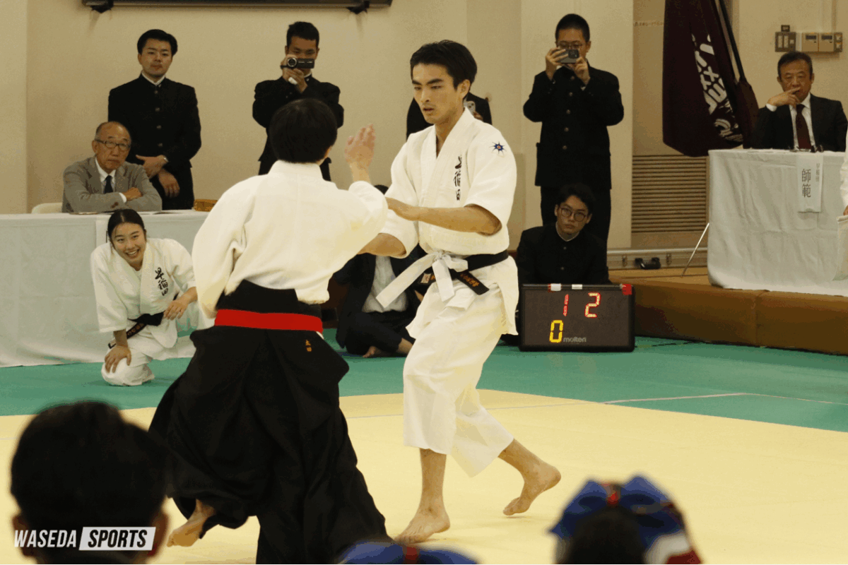 試合は、早慶戦のためにルールが整えられ、演武競技と審査制乱取稽古の二種目が行われた。最初に行われた演武競技では、下級生演武、徒手、坐技、武器技(短刀)、武器技(杖)、自由技の全6試合のうち、3試合が10点差以内という接戦に。早大は坐技と武器技(杖)で勝利を挙げたが、慶大に白星を2つリードされるかたちとなった。