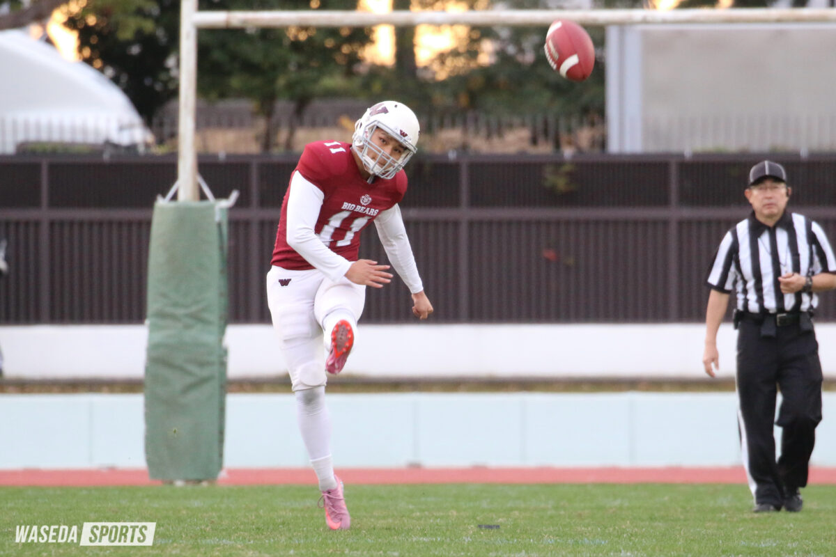 迎えた最終Q、開始直後にはエンドゾーンまで7ヤード地点から立命大RB蓑部が中央を突破し、この日6つ目のTDを許す。しかしここから早大も意地を見せる。DB宮澤源(文構2=東京・麻布)がインターセプトを決めると、RB長内のランで敵陣に侵入する。スペシャルプレーを織り込みながら、RB長内が最後はOL陣が開けた道を抜け、TDを奪う。次の攻撃でも、QB船橋が24ヤードのスクランブルを決め、試合終了1分45秒前にTDを追加した。これまで全てのキックを成功させたK小林も正確にポイントアフタータッチダウンを決め、31ー42までスコアを伸ばした。しかし最後は、立命大にニーダウンで時間を流され試合終了。涙の準決勝敗退となった。