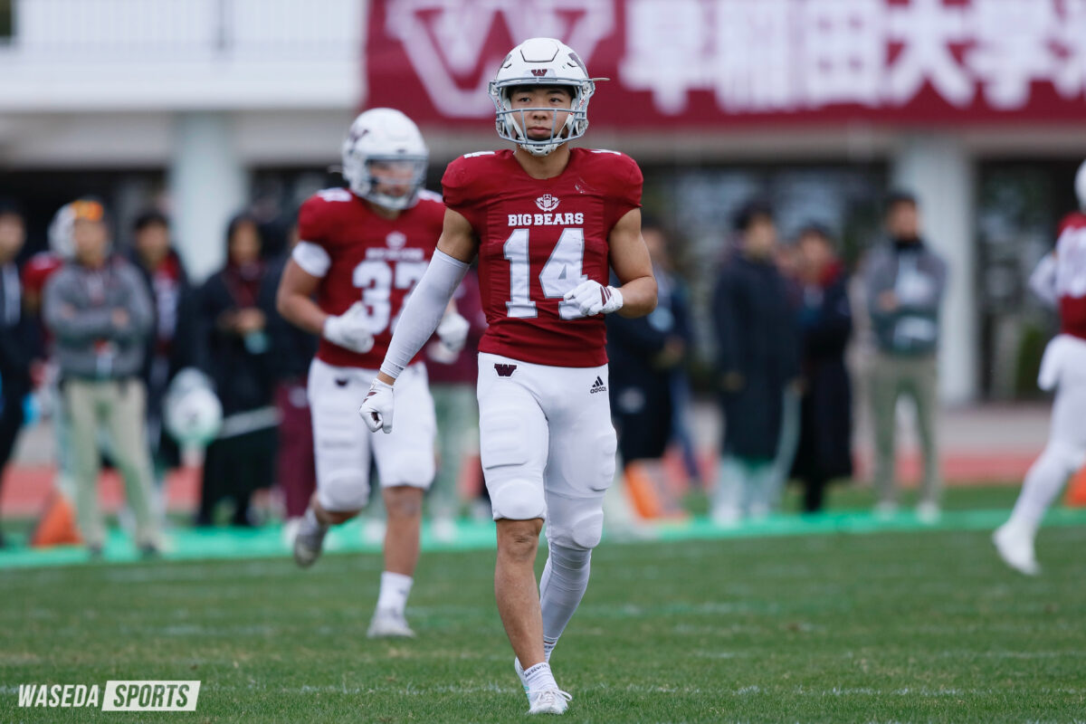 全日本大学選手権準決勝。会場にはスタンドを埋め尽くす観客が駆けつける中、早大BIG BEARSは甲子園ボウル進出をかけた大一番を迎えた。準決勝の相手は昨年同じ舞台で敗れた立命大。その雪辱を晴らすべく、東西のエンジ対決に臨んだ。試合は、序盤から相手に次々とターンオーバーを許し、苦しい時間が続く。10ー21で迎えた後半、QB船橋怜(政経4=東京・早大学院)やRB長内一航(文構3=東京・早実)がタッチダウン(TD)を重ねたものの、立命大の勢いを止められず。後半の追い上げも虚しく、31-42で試合終了。LB功能誠也主将(教4=東京・西)率いる2025シーズンの挑戦は、ここで幕を閉じた。
