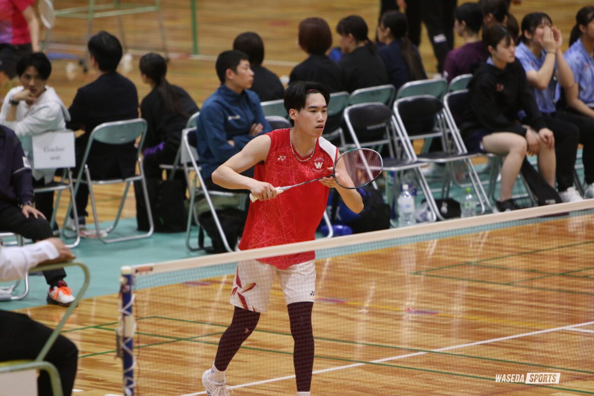 第1ダブルスは今越・大西悠斗(先理4=東京・淑徳巣鴨)のペア。1日目同様即席ペアだったためか、第1ゲームは二人の息が合わず、ぎこちない動きをしてしまう。さらに、早大のエース今越を避けるように大西が狙われ続ける展開に。大西は対応するものの、そのリターンで相手を崩したり得点を決めたりできず、17ー21で落とす。第2ゲームは苦戦する大西に対し今越がフォロー。ラリーに持ち込み着実に点数を重ね、大西も今越に引っ張られるようにリズムを取り戻し始め、連続でスマッシュを決める。12ー15の劣勢から追いつき、一気に追い越し9連続得点で21ー15でこのゲームをとる。この連続得点で勢いに乗った今越・大西ペアに引っ張られるように、ベンチの声援も最高潮に達する。第3ゲームはそのまま勢いを増していき、相手もミスが増え、21ー10で試合を制した。