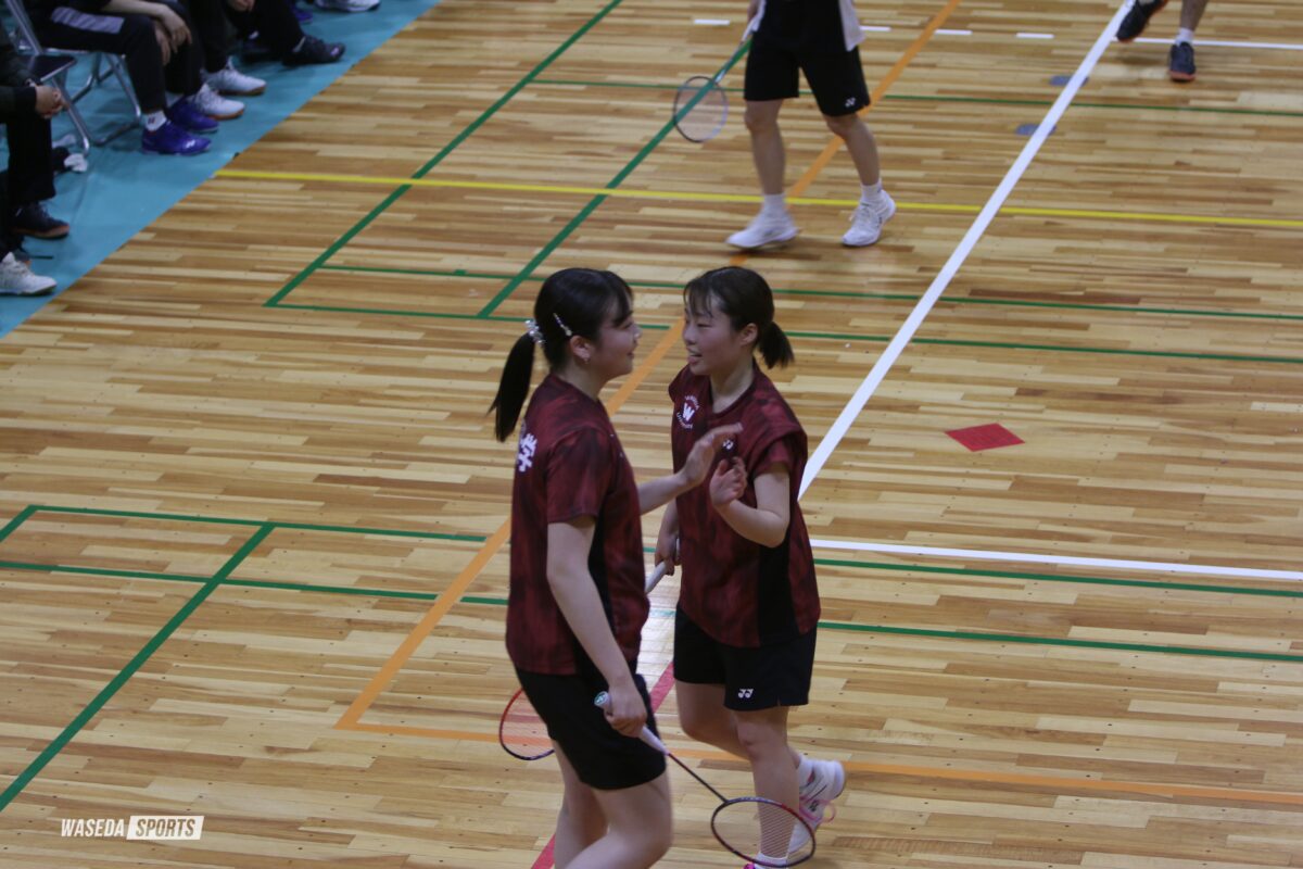 第1ダブルスは原口樹璃(スポ2=福岡・九州国際大付)と高口諒子(スポ2=栃木・作新学院)の2年生ペア。原口のバックハンドの固いレシーブが連発するなど、原口が前衛、高口が後衛というポジションで安定。一方原口が後ろに行った際のスマッシュの決定力が低く、点が入らないのもあり10ー21で第1ゲームを落とす。1ゲーム目の学びを活かして臨んだ第2ゲーム。高口のスマッシュが機能し、序盤はリード。奥へのクリアと前へのドロップを織り交ぜ、相手の体勢を崩して得点を重ねた。しかし相手もこちらの戦いに慣れたのか13点目以降は点の取り合いに。ラリーで粘るも惜しくも18ー21で敗戦した。