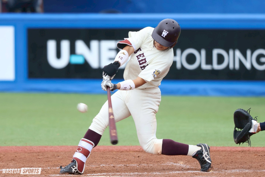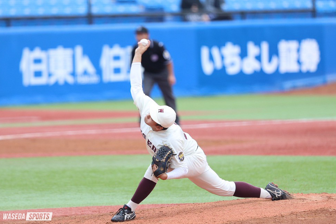 東京六大学秋季リーグ戦は第4週を迎え、早大は折り返しとなる法大戦に臨んだ。ここまで2位につけ、優勝へ向けてまずまずの戦いを見せている早大だったが、この日は流れをつかみきれず。先発のエース・伊藤樹(スポ4=宮城・仙台育英)が5回3失点で降板すると、後を受けた越井颯一郎(スポ3=千葉・木更津総合)も1点を失い4点のビハインドを背負う。終盤に打線が奮起し同点に追いついたが、9回に4番手・宮城誇南(スポ3=埼玉・浦和学院)が勝ち越し打を浴び、4-5で初戦を落とした。