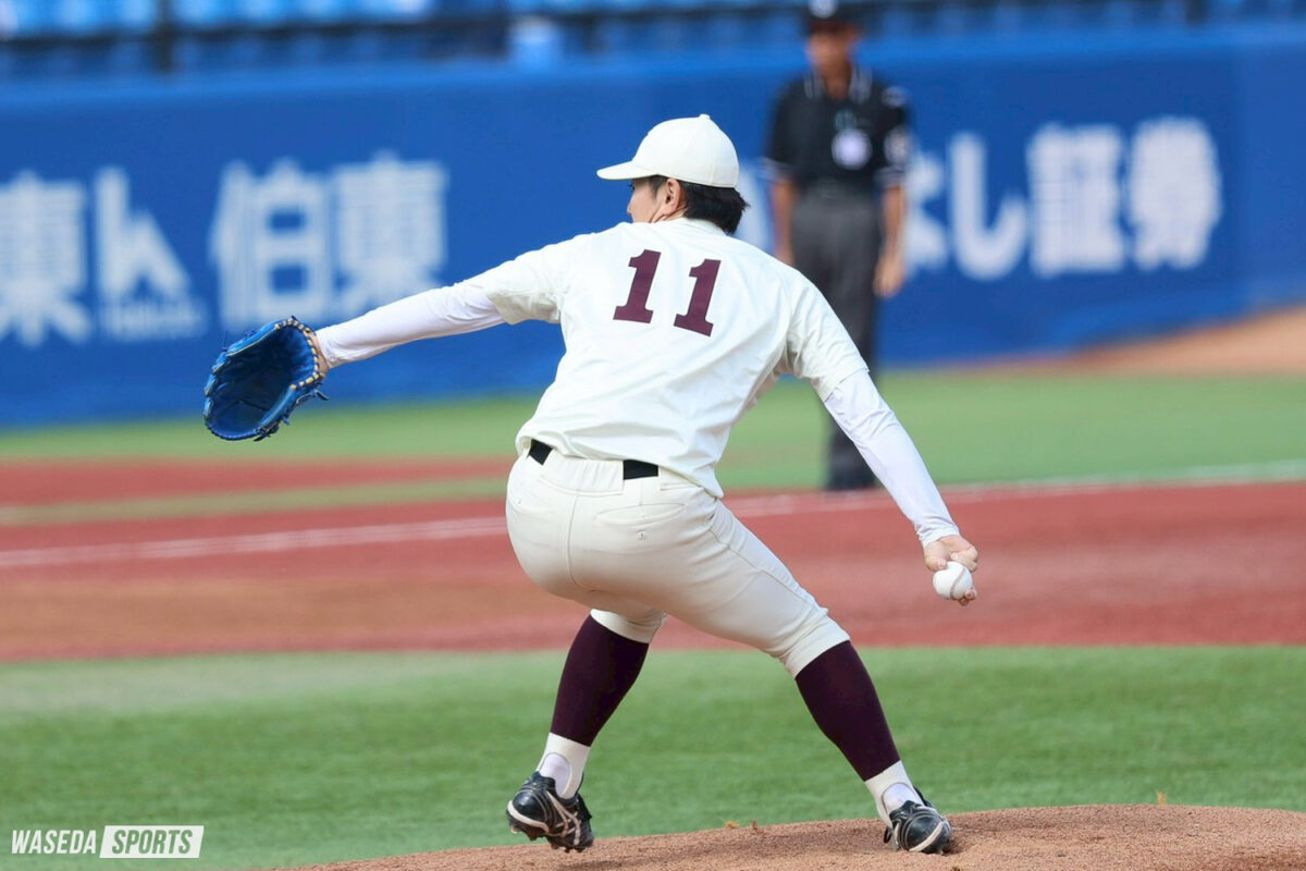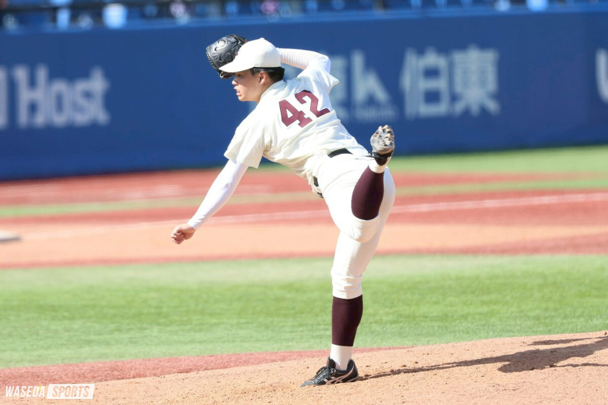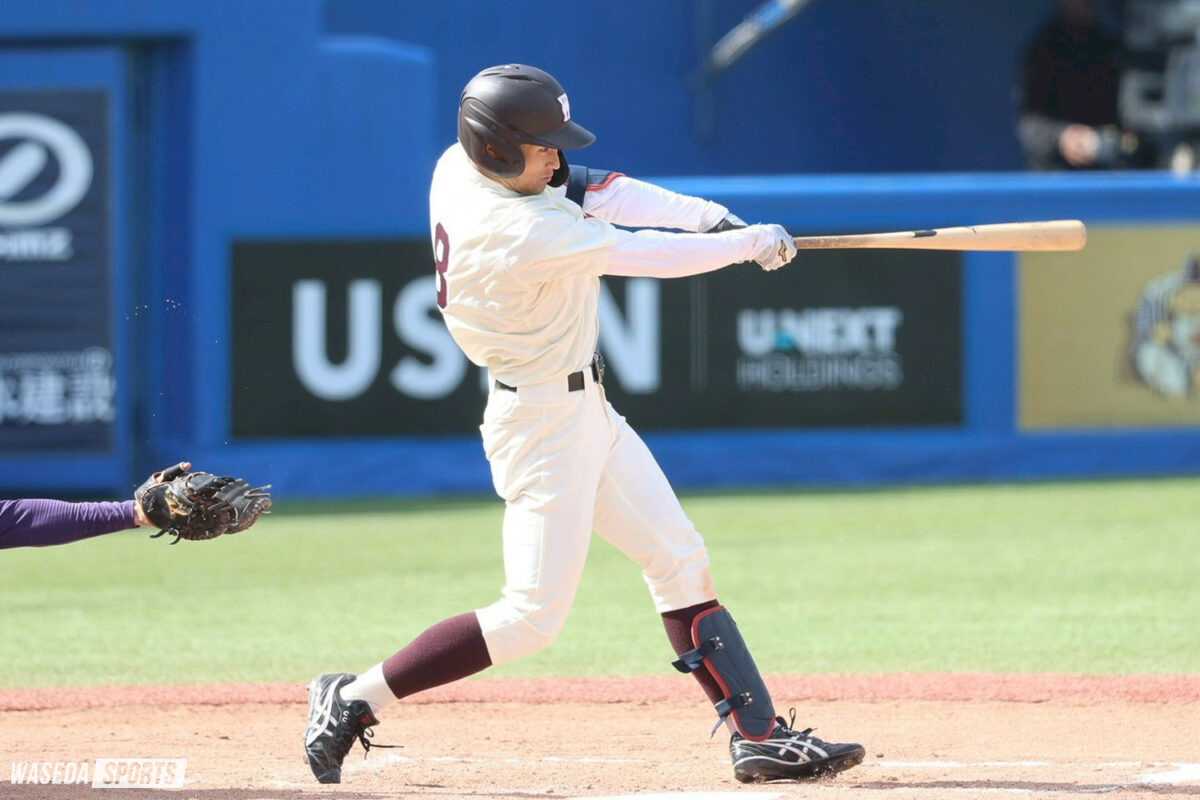 打線は直後の3回、ここまで完璧に抑えられていた明⼤・⽑利海⼤(4 年)から吉⽥瑞樹副将(スポ4 =埼⽟・浦和学院)が右前安打で出塁すると、9番・伊藤樹の犠打で⼆塁に進むが、ここは尾瀬雄⼤(スポ4=東京・帝京)が⼆ゴロに倒れ、チャンスを⽣かすことができなかった。