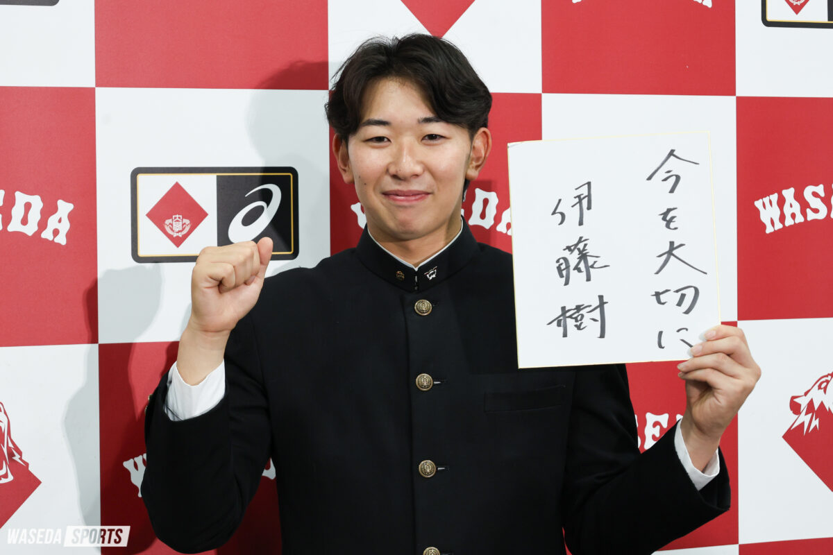 楽天から2位指名を受けた伊藤樹(スポ4=宮城・仙台育英)と巨人から2位指名を受けた田和廉が早大東伏見キャンパスで記者会見に臨んだ。2人の喜びの声を紹介する。