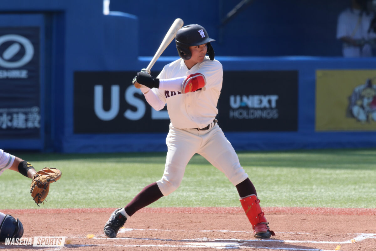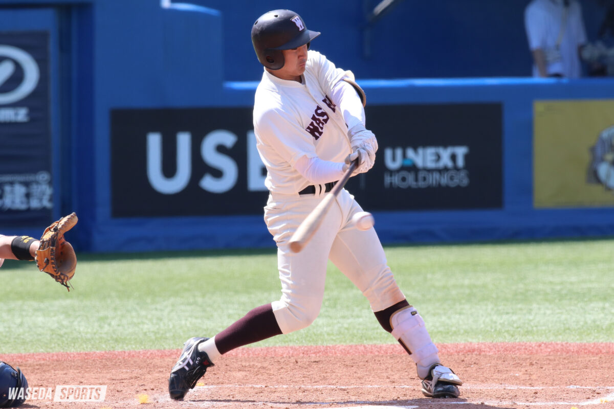 1死から川尻が中前安打で出塁すると、阿部葉太(スポ1=神奈川・横浜)の内野安打でチャンスを拡大。2死一、三塁で本日初スタメンの湯浅桜翼(スポ2=宮城・仙台育英)を迎えた。カウント2-2から甘く入った変化球を振り抜くと、打球はぐんぐんと伸びセンターオーバー。2者が生還し、早大が2点を勝ち越した。さらに続く岡西佑弥副将(スポ4=智弁和歌山)が今季初ヒットとなるライトへのタイムリーを放ち、6-3。ここまでの鬱憤を晴らすような猛攻で早大が一気にリードを奪った。