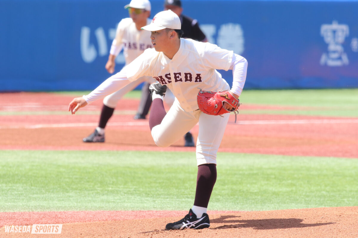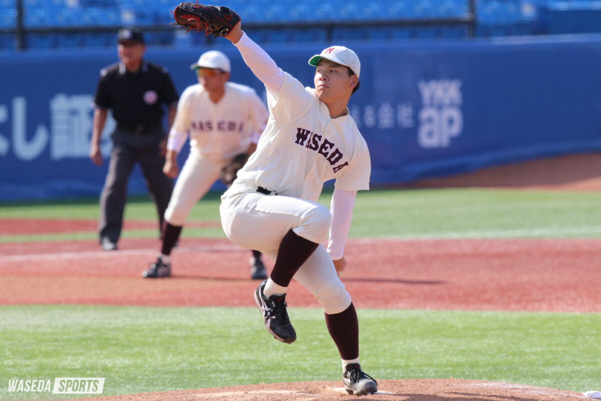 早大の先発は越井。しかしこの日は苦しい投球となった。初回から自慢の直球を痛打され、3本のヒットで1死満塁のピンチを招く。続く5番の大沼亜斗夢(東大2年)にセンター前へのタイムリーを打たれ、1点を失った。その後の打者は打ち取ったが、さらなる試練は2回。この回も3本のヒットで1死満塁となる。ここで打撃好調の3番・秋元諒(東大3年)にセンターオーバーの2点タイムリーを浴び、手痛い3失点目を喫した。