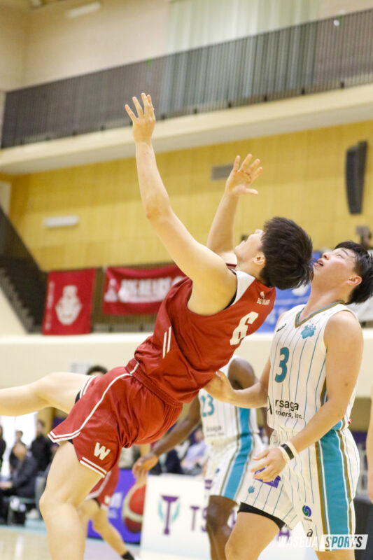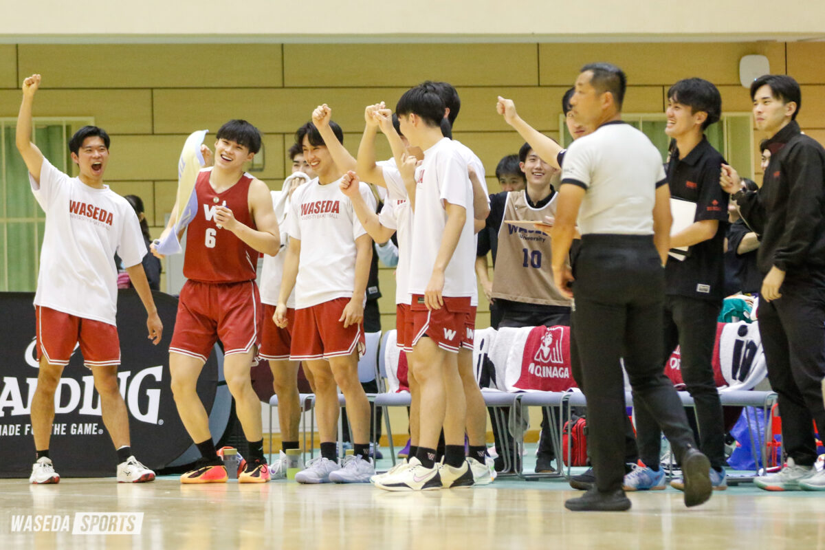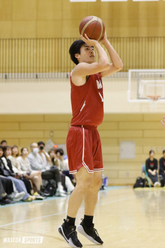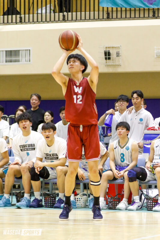 F南川陸斗(文1=京都・東山)と筑波大の声出し合戦で始まった試合は、第1Qから早大の長距離砲がさく裂する。G堀田尚秀副将(スポ4=京都・東山)とF松本秦(スポ1=京都・洛南)の3Pシュートで早大がリードを奪うと、高田の連続スリーがヒット。一気に9点差へ突き放し、試合の主導権を握った。