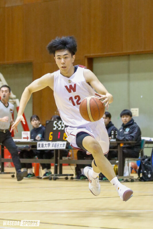 関東大学リーグ戦(リーグ戦)は今季最大の山場を迎えた。ここまで16勝2敗で首位を走る早大と、15勝3敗で2位につける東海大。優勝を争う2校の直接対決がリーグ最終盤に実現した。注目の一戦は第1Qから早大のオフェンスが絶好調。37-17でいきなり20点のリードを奪った。その後も早大は高い確率で3Pシュートを沈め、110-90で勝利。首位攻防戦を制し、優勝マジック1が点灯した。