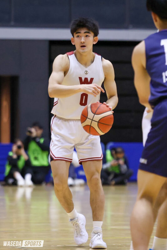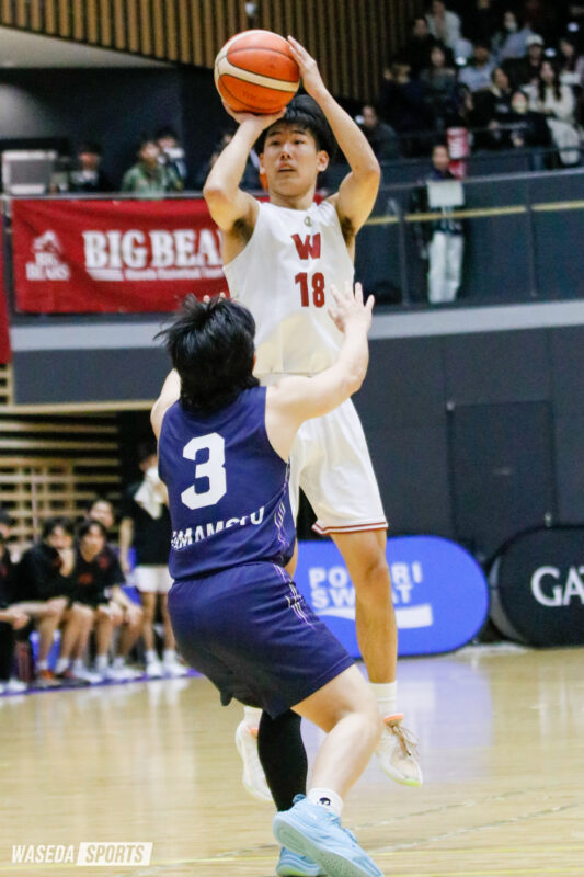しかし、早大の反撃はここからだった。岩屋主将がミドルシュートを沈めると、F堀陽稀副将(スポ4=京都・東山)の豪快なダンクシュートで流れは一気に早大へ。Q残り約3分にはG高田和幸(商4=京都・洛南)がこの日チーム初の3Pシュートを沈めると、堀副将、F松本秦(スポ1=京都・洛南)も続けざまに3Pシュートをヒット。点差を6点に縮め、試合を折り返した。