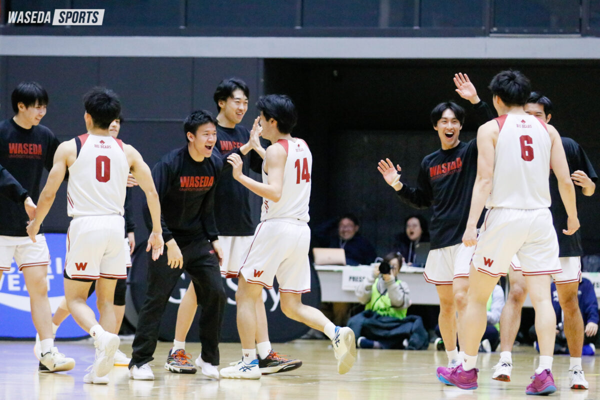 勝負を決する第4Qは、この日も岩屋主将の独壇場だった。多彩なオフェンスパターンでリングを射抜き、このQ11得点。相手のシュートが落ち続ける中、この時間で一気にリードを拡大した。終盤には下山と松本が5つ目のファウルを犯したが、着実に逃げ切り83-72で試合終了。最大19点のビハインドをひっくり返し、早大が準々決勝に駒を進めた。