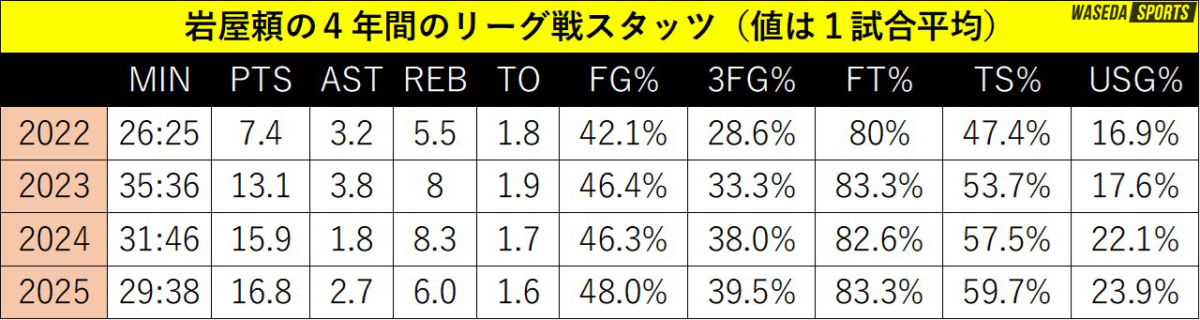 4年間のスタッツが示すように、岩屋の得点と得点効率は年々右肩上がり。3×3がスコアリングガードとしての進化に貢献していることは間違いない。