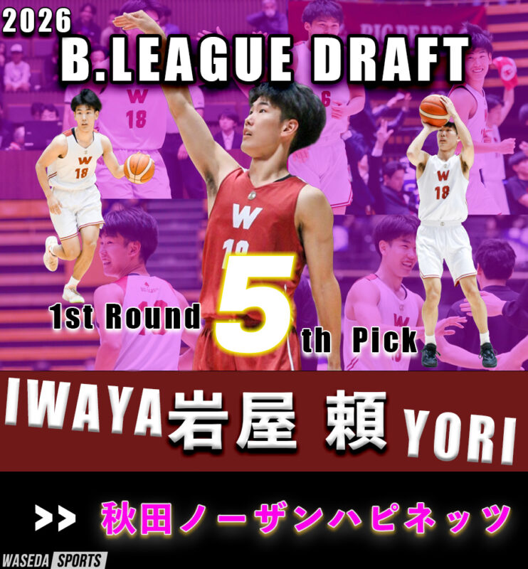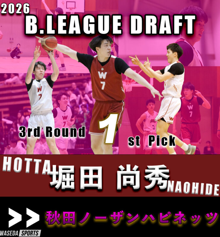 1月29日に開催された第1回Bリーグドラフト。早大からはG岩屋頼主将(スポ4=京都・洛南)、F堀陽稀副将(スポ4=京都・東山)、G堀田尚秀副将(スポ4=京都・東山)の3名がエントリーした。岩屋は1巡目5位(全体5位)で秋田ノーザンハピネッツ、堀田は3巡目1位(全体9位)でこちらも秋田ノーザンハピネッツからの指名。両選手がプロへの扉を開いた。一方の堀は指名漏れとなり、Bプレミア以外のチームとの契約を模索する。