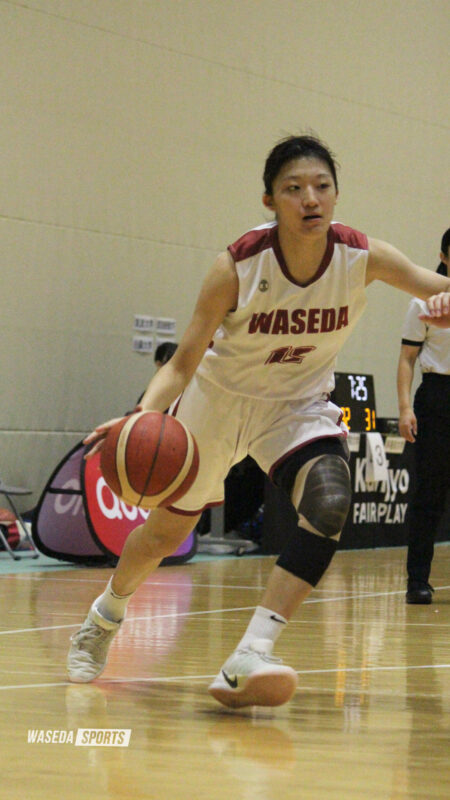 第2Qでは早大のパスが繋がらず、攻撃が崩れる場面が多く見られた。アチャラオゲチクランシー(山梨学院大・3年)がインサイドを支配し、ゴール下からの攻撃を阻まれてしまう。相手のしぶといディフェンスに苦戦し、ディフェンスファールを誘発され逆転されてしまう。菊池は積極的な攻撃を仕掛けるも、自らディフェンスを引きつけてしまいシュートを打つことができない。しかし、福王のパスカットから素早い攻撃を見せ、流れを完全には渡さなかった。終盤、西副将がフリースローで追い上げをみせ、ラスト3秒、F阿部心愛(スポ1=愛知・桜花学園)がバスケットカウントを決めて逆転し2点差で前半を終えた。