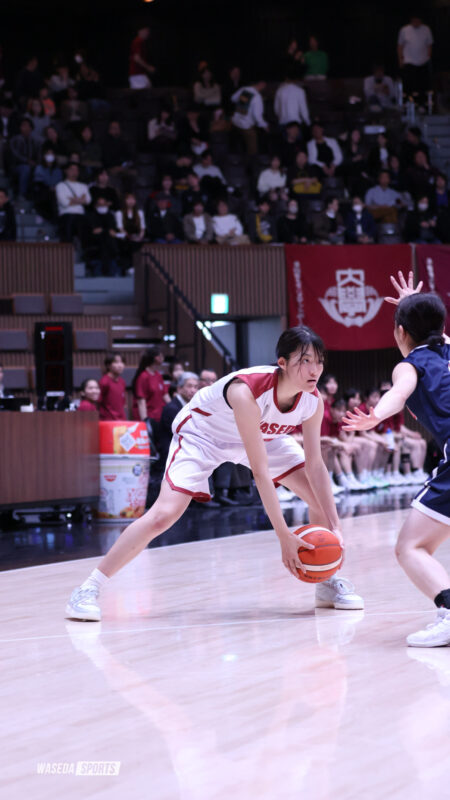また、F衣川璃来(スポ3=埼玉栄)もハンドラーを務める。今季はリーグ10位の平均14.5得点を記録したスコアラー寄りの選手だが、高いハンドリング能力を生かしガードとしても活躍中。山宮がベンチに下がる時間は衣川がオフェンスをつくっている。