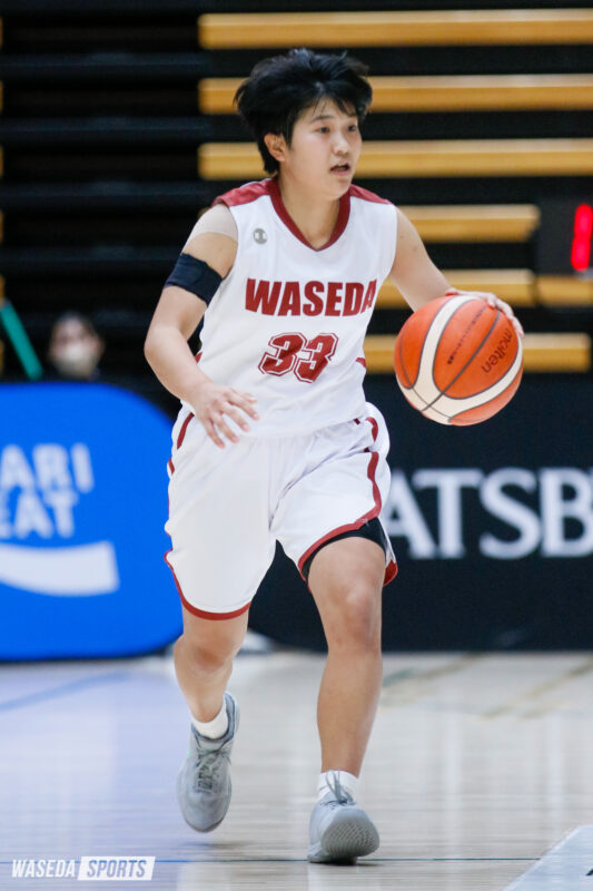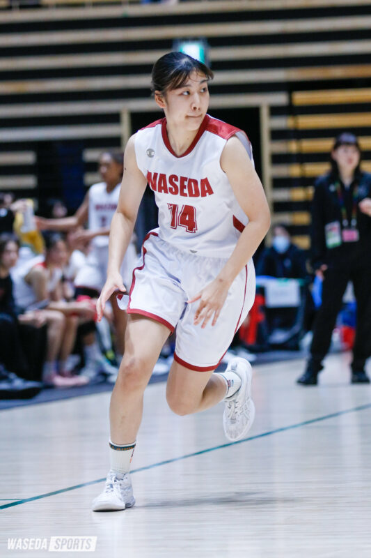 試合開始直後、F菊地実蘭(スポ3=愛知・桜花学園)のスリーポイントが決まり早大は勢いがつく。留学生のいない順大に対し、守備の要であるC福王伶奈(スポ2=愛知・桜花学園)を中心に早大はオフェンスリバウンドを制する。中盤では西副将が積極的なプレーでファウルを奪い5点追加し好調の滑り出しを見せた。第2Qに入っても流れを渡さず早大の得点が重なる。ここで怪我からの復帰後、初の試合となるG中村真都(教3=長崎西)がコートに入る。鋭いドリブルとパスで相手のディフェンスをかわし早大のシュートチャンスを増やした。そのまま52-36で試合は後半戦へ。