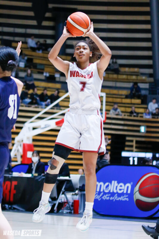 秋のリーグ戦では入れ替え戦を経験し、無事に1部残留を決めた早大は、今日第77回全日本大学選手権(インカレ)の初戦を迎えた。「日本一」を目標に掲げて挑むインカレ。対戦相手は九州1位の日本経済大学を敗り駒を進めてきた順大だ。前半、試合の立ち上がりからオフェンスリバウンドを次々ともぎ取り順調に得点を重ねていく。F西ファトゥマ七南副将(スポ4=千葉・昭和学院)のシュートが決まりブザーが鳴ったところで前半終了。52-36と点差をつけ好調のまま試合は後半戦へ。続く第3Qは、シュートの決まらない時間帯が見られたが、相手にも点を取らせずビハインドをキープ。最終Qでは途中30点近く差をつけ、F望月綾乃主将(スポ4=東京・実践学園)やG橋本芽衣(スポ1=京都精華学園)も出場し87-62で勝利した。