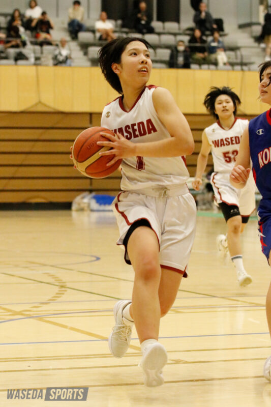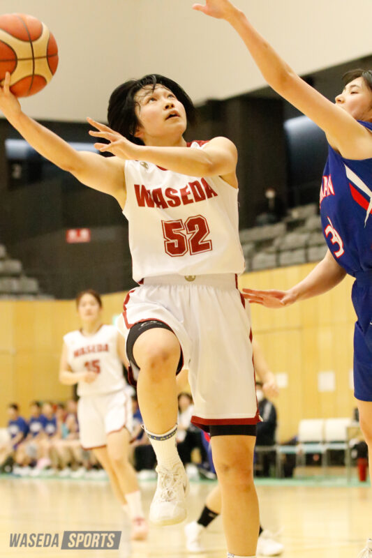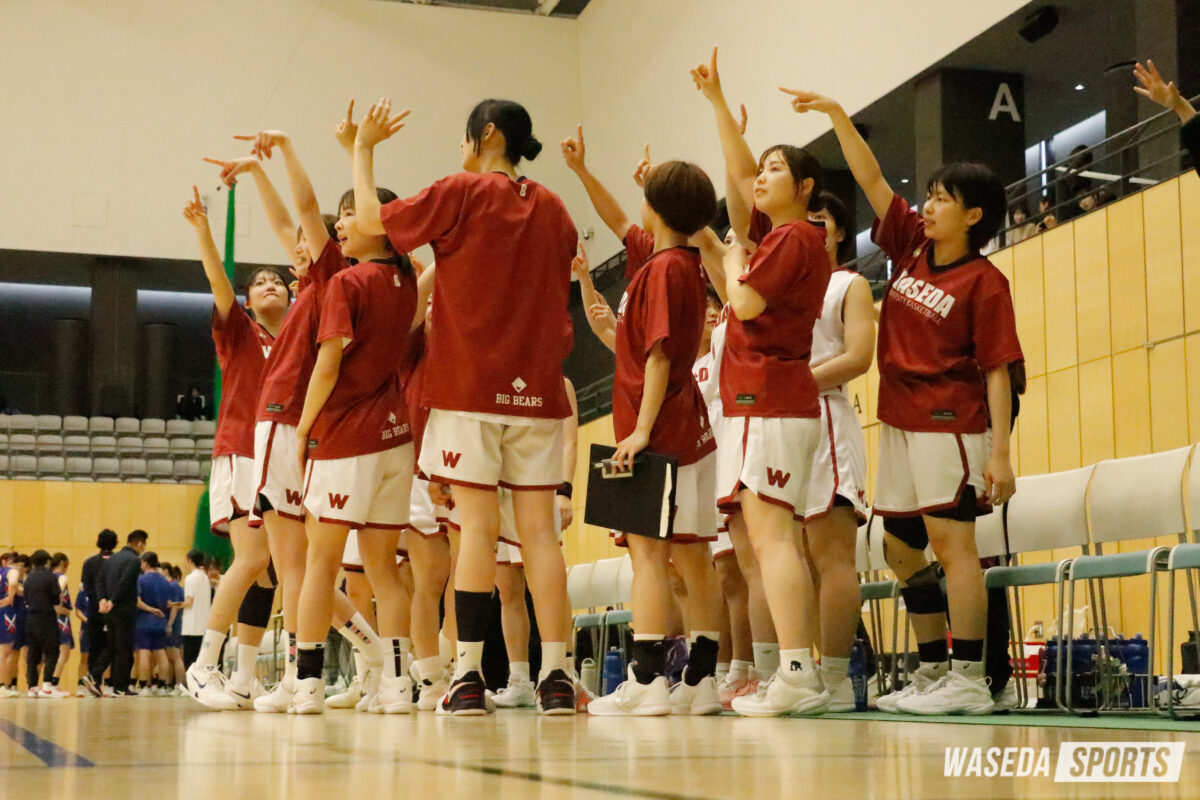第4Qはベンチメンバーが出場。F牧芙羽香(商3=埼玉・早大本庄)は約6分の出場で7得点を挙げた。最後まで危なげなく逃げ切り、103-44で試合終了。スプリングトーナメントの初戦を飾った。