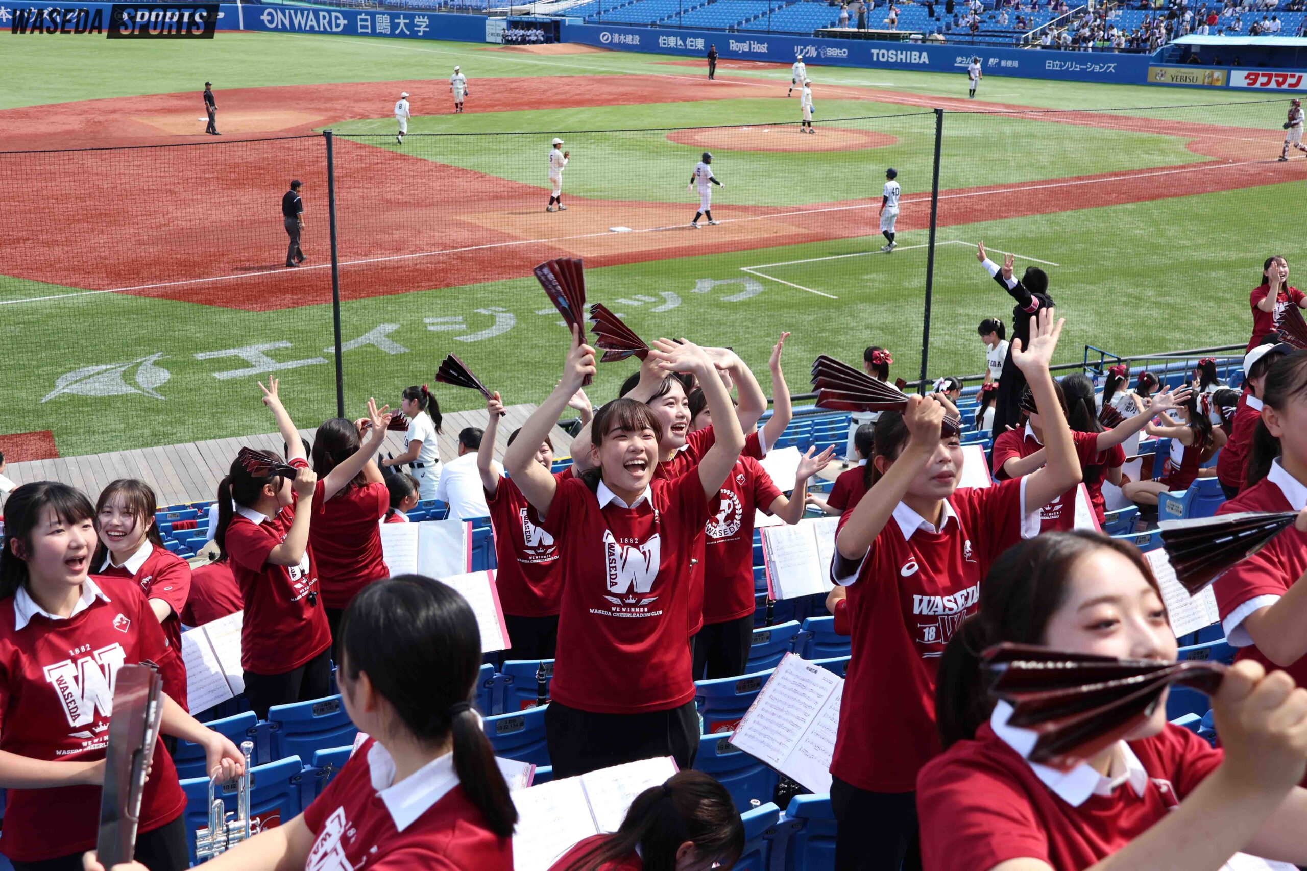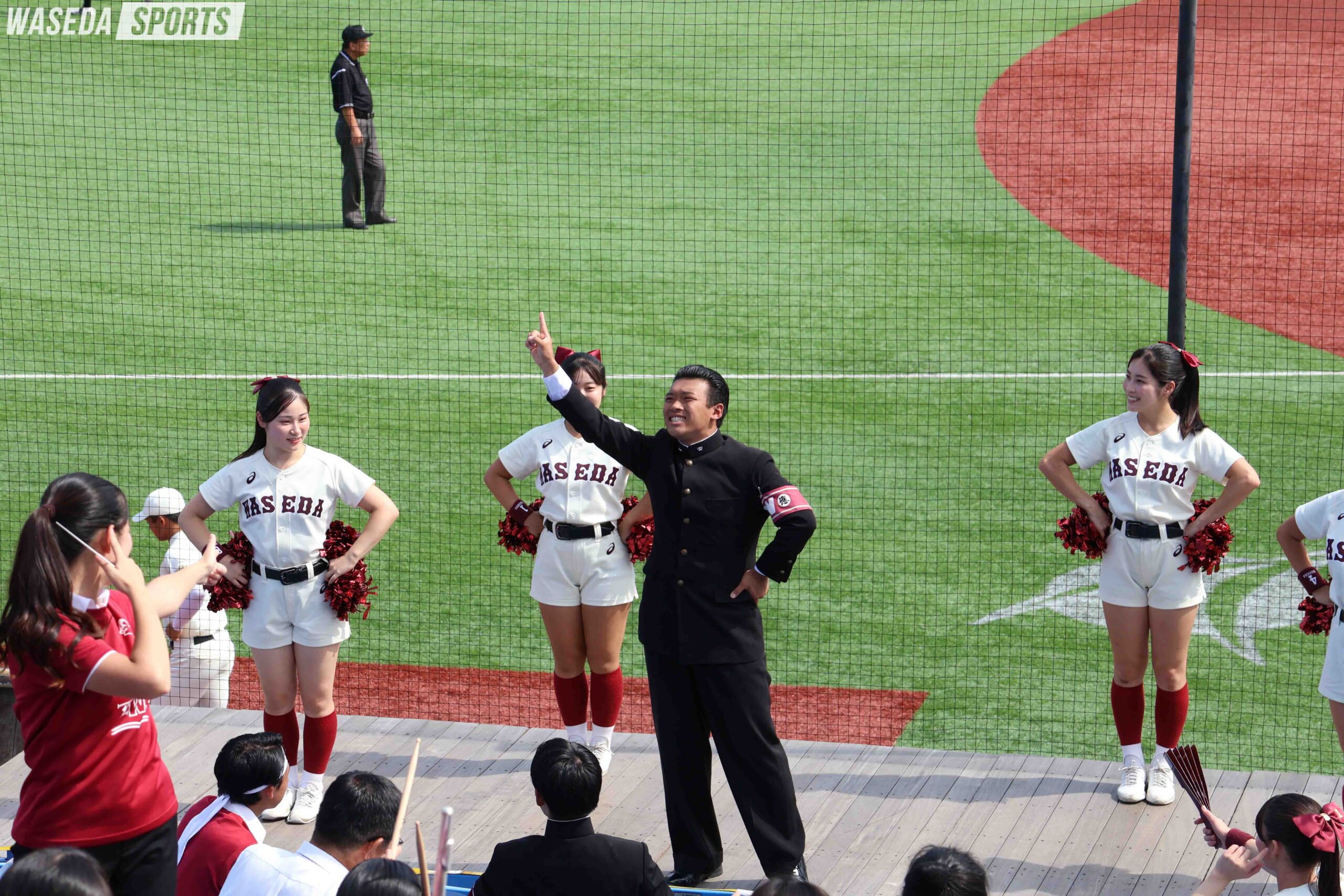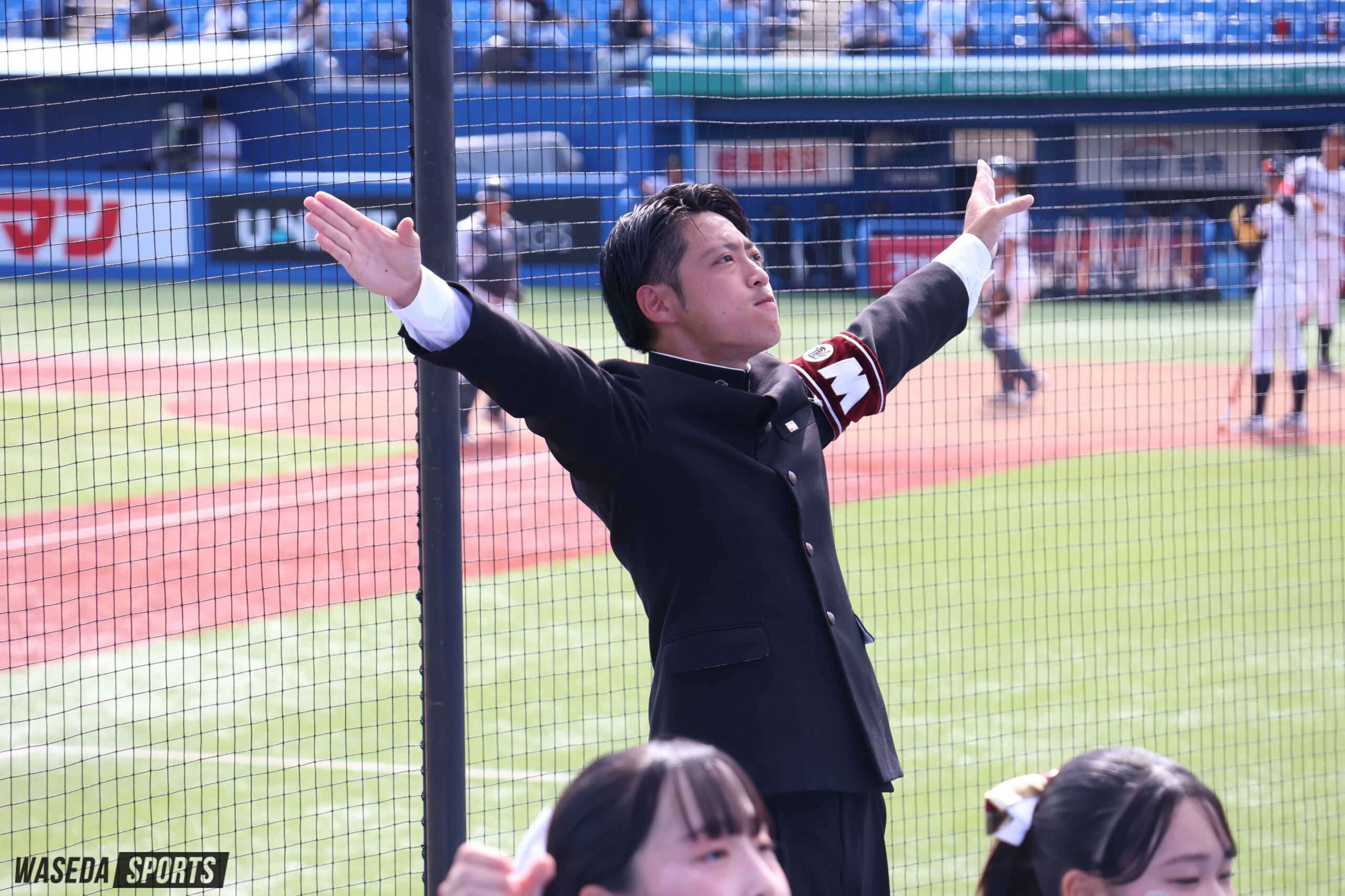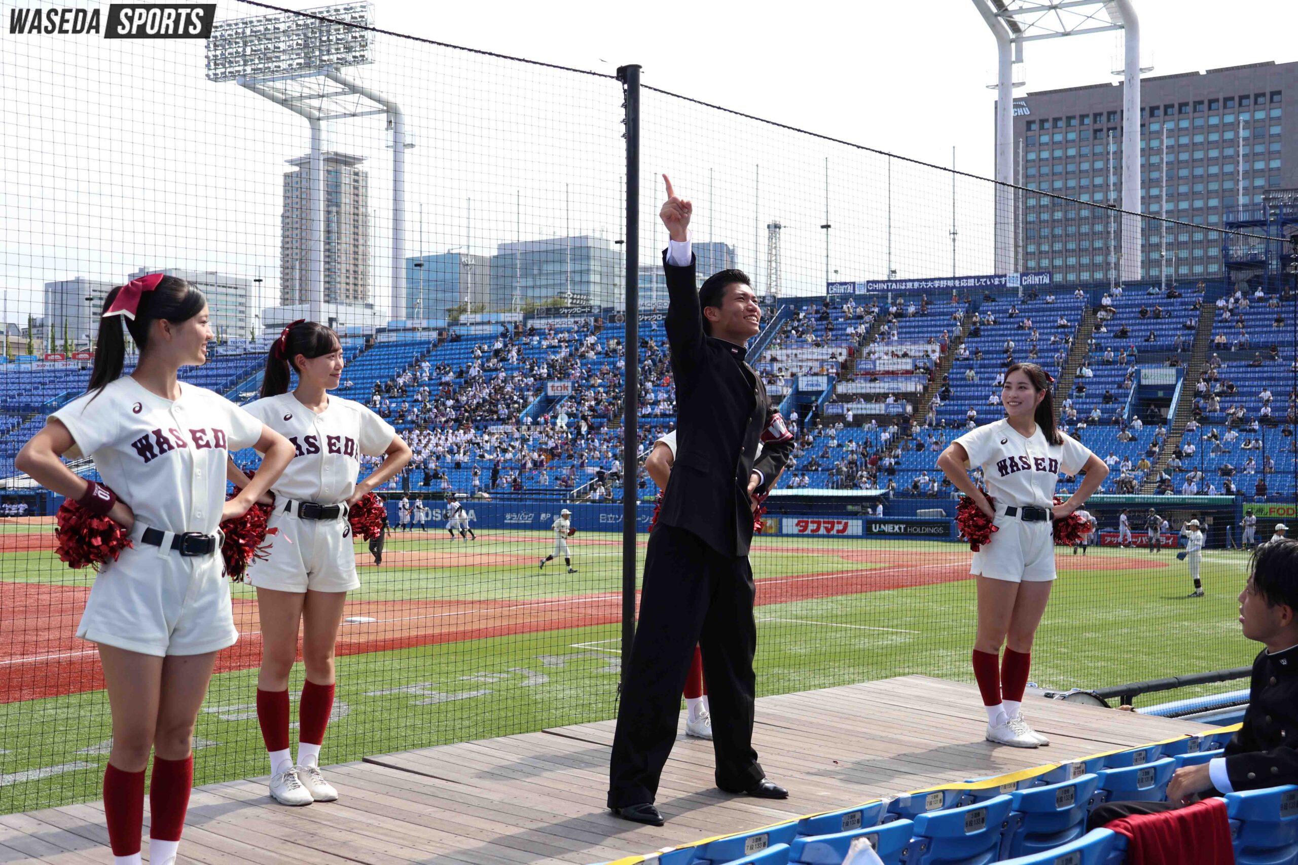 試合は5回。武本啓良(社3=東京・早実)による指揮の下、『Viva Waseda』が球場に響く。すると、今季初スタメンの田村康介(商4=東京・早大学院)が中前安打で出塁。吉田瑞樹副将(スポ4=埼玉・浦和学院)が死球、伊藤樹(スポ4=宮城・仙台育英)が安打で続き、満塁のチャンスを創出する。ここで応援部は『雷轟』、『F1〜コンバットマーチ』などのチャンスの場面での定番曲でエールを送る。しかし、ここは後続が倒れ、チャンスを生かすことができなかった。