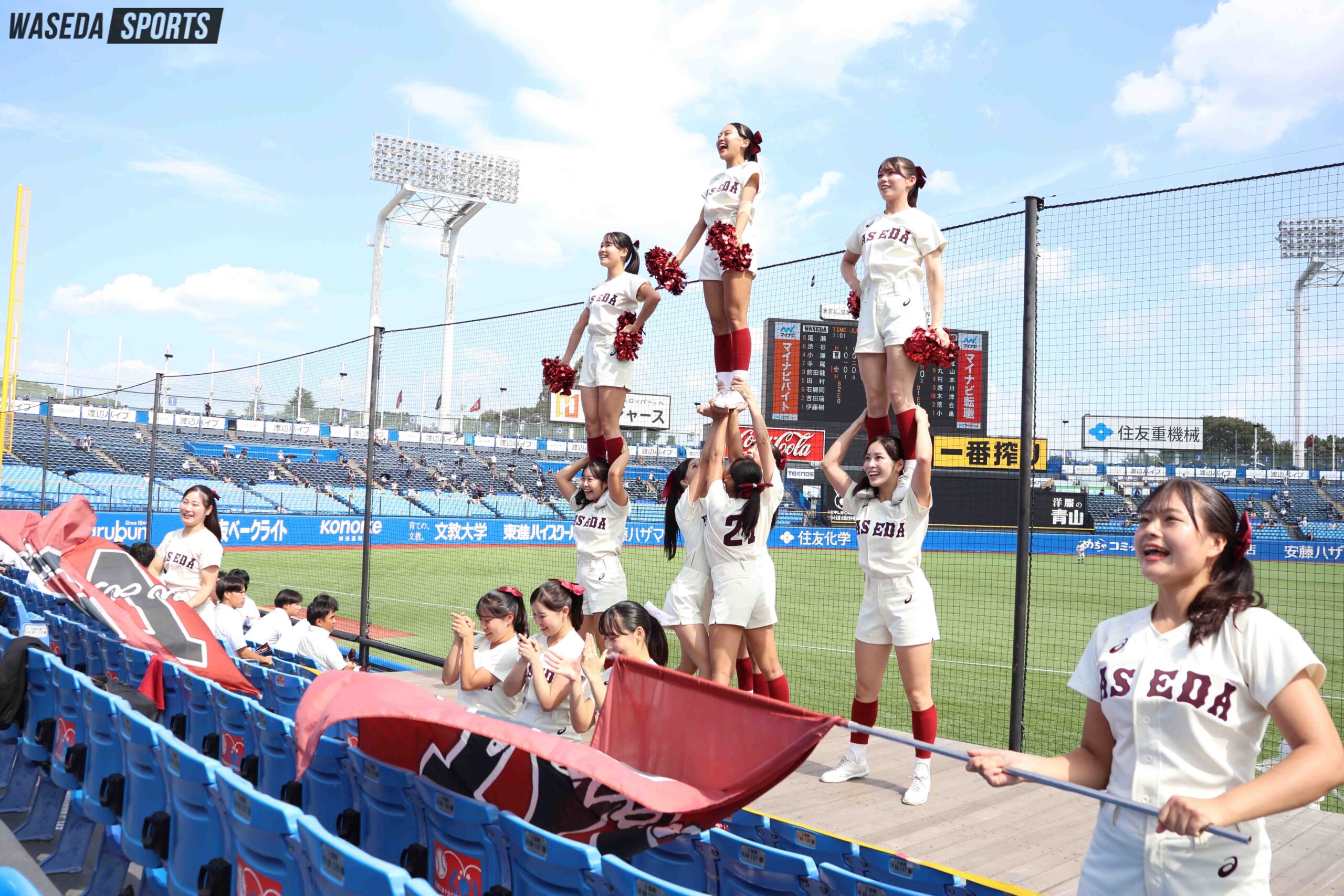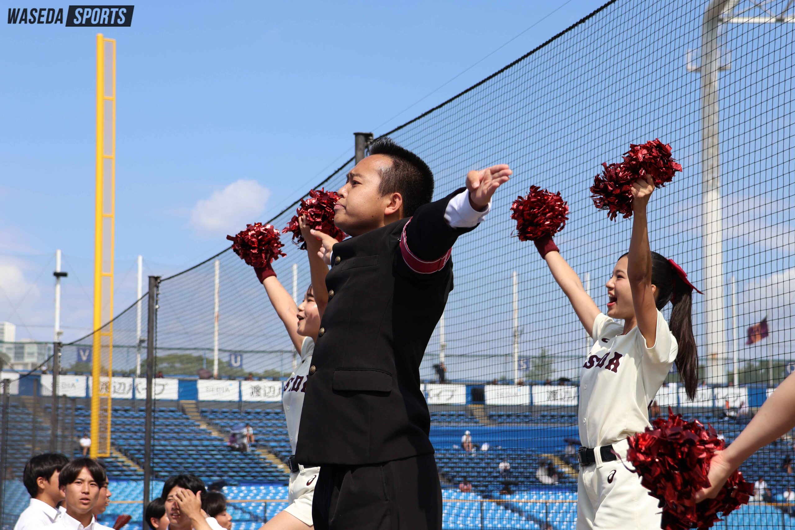 その5回裏の守備。早大はバッテリーエラーも絡み、相手の内野ゴロ間に先制を許した。拮抗した展開で先制を許した早大だが、応援席では『健児コール』などを応援部員が観客に笑顔を見せながら行った。まず追いつきたい早大打線は、6回にヒットエンドランを成功させ、この日2度目の『雷轟』から『F1〜コンバットマーチ』という応援の流れを迎えた。絶対にチャンスを掴みたいこの場面だったが、ここも後続が倒れ、無得点でこの回を終えた。