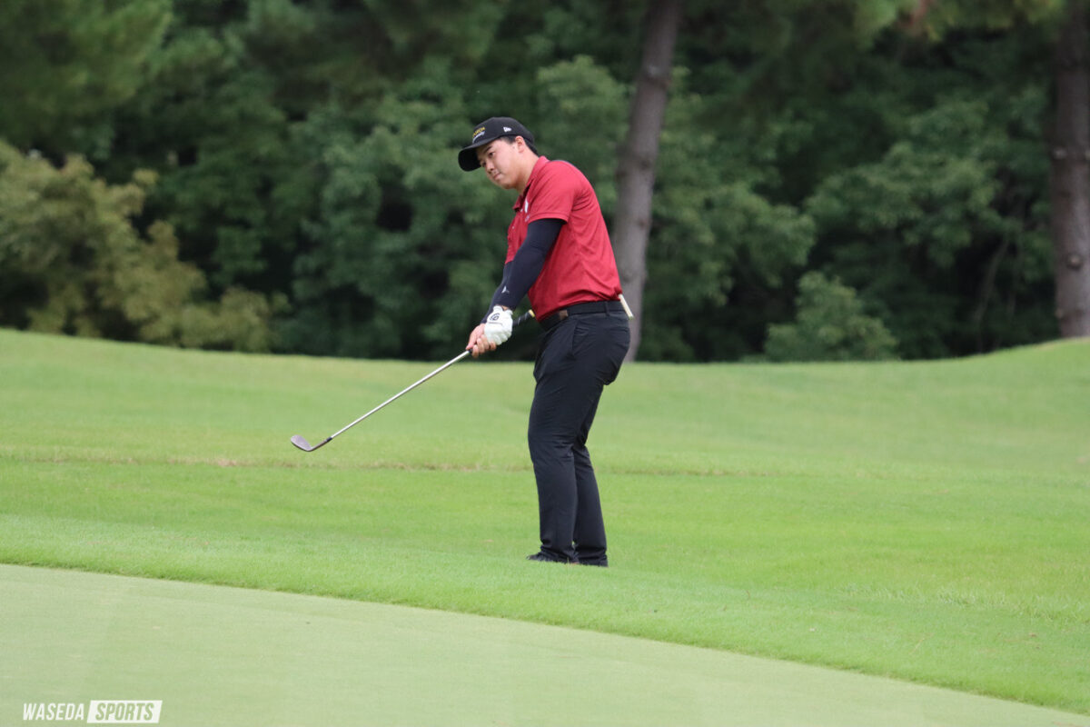 早大が初日に対戦したのは中央学院大。スタートダッシュを決めたい早大であったが、午前に行われたダブルスではまさかの3敗1分。勝ち星なしで午後のシングルスに挑んだ。シングルスでは竹原佳吾副将(社4=東京・早実)と安保卓哉(商4=東京・早実)が共に6&5という圧倒した内容で相手に勝利する。また、松﨑泰知(人2=山口)はパー5の8番ホールでイーグルを出す活躍を見せるも18ホールを終えて、オールスクエア(AS)となり決着つかず。シングルスでは3勝3敗2分となり、イーブンで終えたものの、ダブルスの結果が響き、初日は勝ち点を得ることができなかった。
