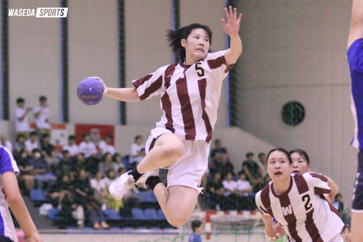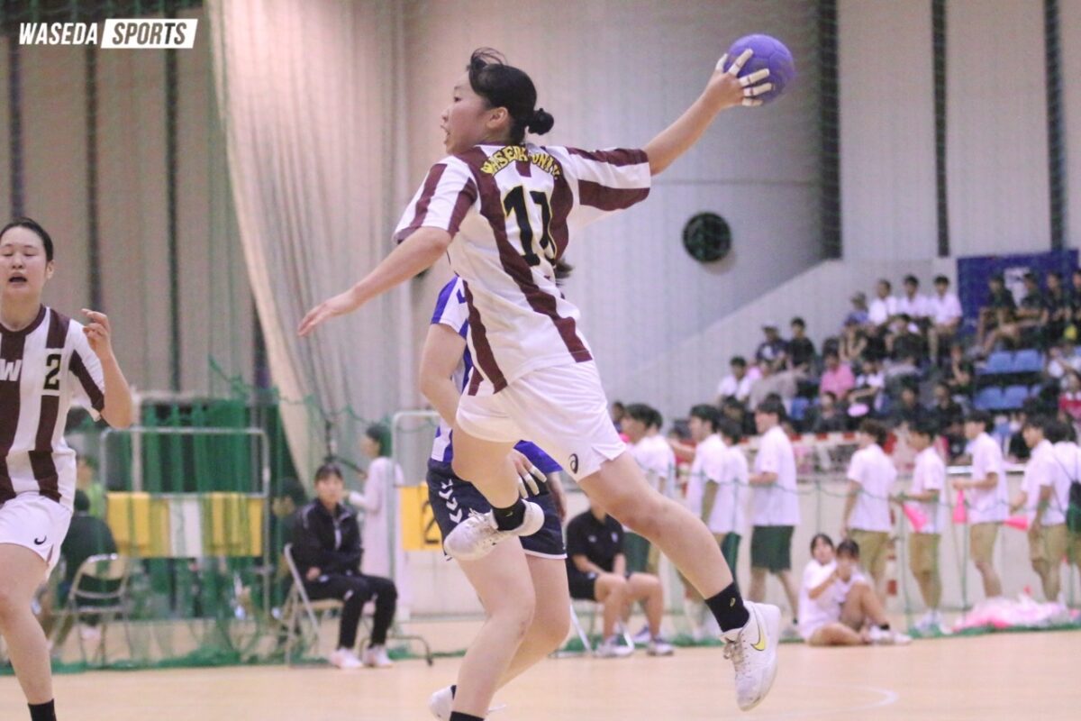 ディフェンスから始まった今試合。前半29秒で先制点を献上するも秋季リーグの中で反省点として挙げることの多かった前半での立ち上がりを、7試合を通して修正し、ディフェンスからの速攻などで4連続得点。3点リードの展開に。さらに前半10分、ボールを受けた倉持愛泉(スポ1=千葉・昭和学院)が持ち前のスピードでディフェンスをかわしシュートを決め、5点リードと波に乗る早大。守備では運動量の多いディフェンスと堀内雪羽(スポ2=千葉・昭和学院)のセーブでリードを保つ。しかし強豪・東海大は強さを見せつけ後半22分から連続でシュートを決められる。逆転を許すと後半28分、山野紗由(スポ4=北海道・釧路江南)からのパスを受けた倉持がシュートを決め同点に並び粘り強さを見せるも1点を返され14―15で前半を折り返す。