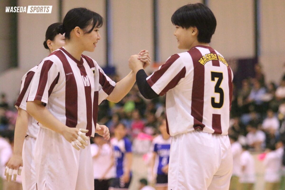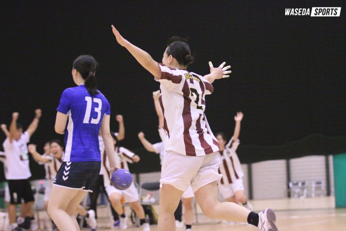 1点ビハインドで迎えた後半、東海大に前半の流れを持ち込まれ6分で4点差に。これ以上リードを広げられたくない早大は、必至な思いでそれぞれが役割を全うする中、後半8分。杉浦亜優主将(スポ4=愛知・名経大市邨)が相手のボールを奪い、一度倉持に託すも最後は自分でゴールに沈めて得点。ここから早大の反撃が始まる。ディフェンスでは速攻までを見据えパスをカットし東海大のミスを誘うプレーが続く。シュートを打たれても堀内のセーブで得点を与えず、後半18分までに4点を返して同点に。保護者だけでなく、この日同じ会場で試合をしていた早大男子ハンドボール部も応援に駆け付け、会場が大盛り上がりとなる。さらにプレーに勢いが増す早大は後半19分、倉持のパスから杉浦が渾身の右腕で放った一投でネットを揺らし、ついに逆転。そして相手のミスを井橋萌奈(スポ3=東京・白梅学園)が山田梨央副将(スポ4=千葉・昭和学院)につなげて速攻でサイドシュートを決め3点リードの展開に。笑顔が溢れる選手らは最後まで勢いを絶やさず得点を重ね、29―25で試合終了。強豪相手に見事な逆転勝利を収め、最終戦への弾みをつけた。