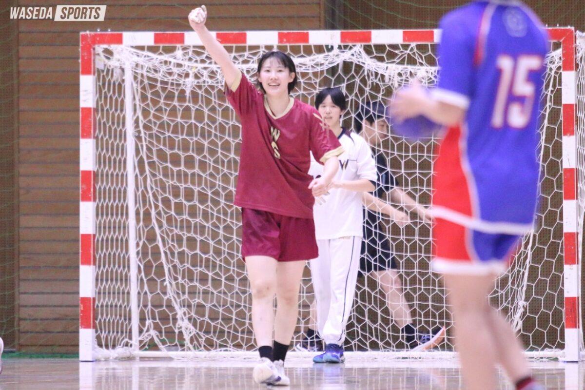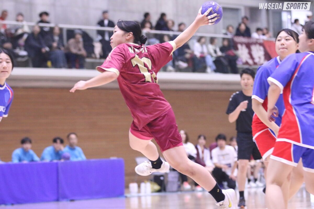 インカレならではの緊張感ある雰囲気が漂う中、早大ディフェンスで試合が始まった。「試合に出ている以上は自分のプレーにしっかり自覚と責任を持って」と話すルーキー・倉持愛泉(スポ1=千葉・昭和学院)がロングステップシュートを打ち込むものの決まらず、相手に先制を許す。しかしすぐさま早大も反撃。井橋萌奈(スポ3=東京・白梅学園)がディフェンスの1、2枚目間を割ったシュートで1得点目を決めると、倉持が獲得した7メートルスローで連続得点。流れがこちらに傾くかと思われたが、サイドに寄せたシュートがなかなか決まらない時間が続く。それでも大野蒔絵(スポ3=埼玉・市立浦和)や江頭理紗(スポ3=東京・ICU)が苦しみながらも得点を重ねた。前半25分までに6-9とロースコアな展開となっていたが、ついにエース山野が目覚める。持ち前のミドルシュートやスカイプレーでチームを鼓舞し9-11で前半を終えた。
