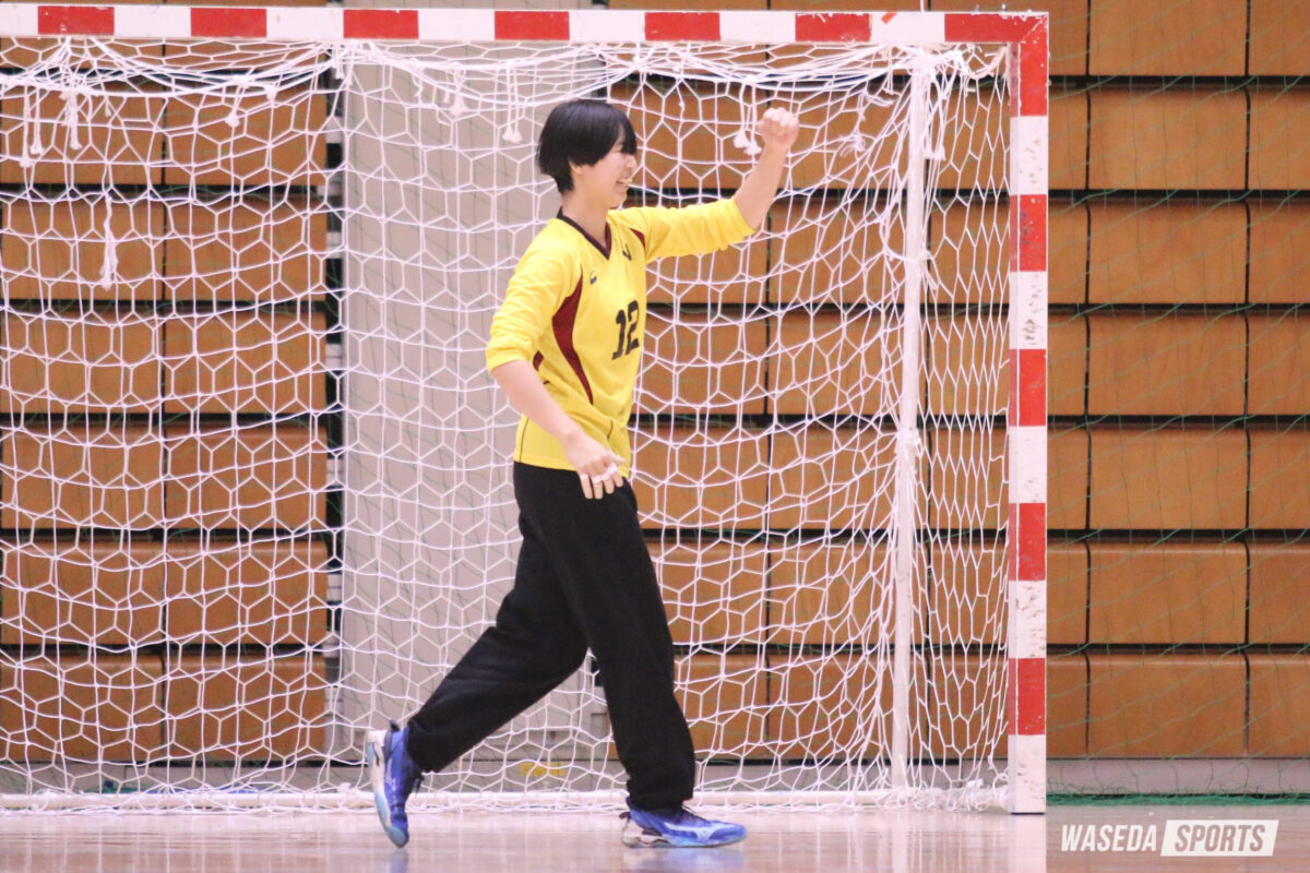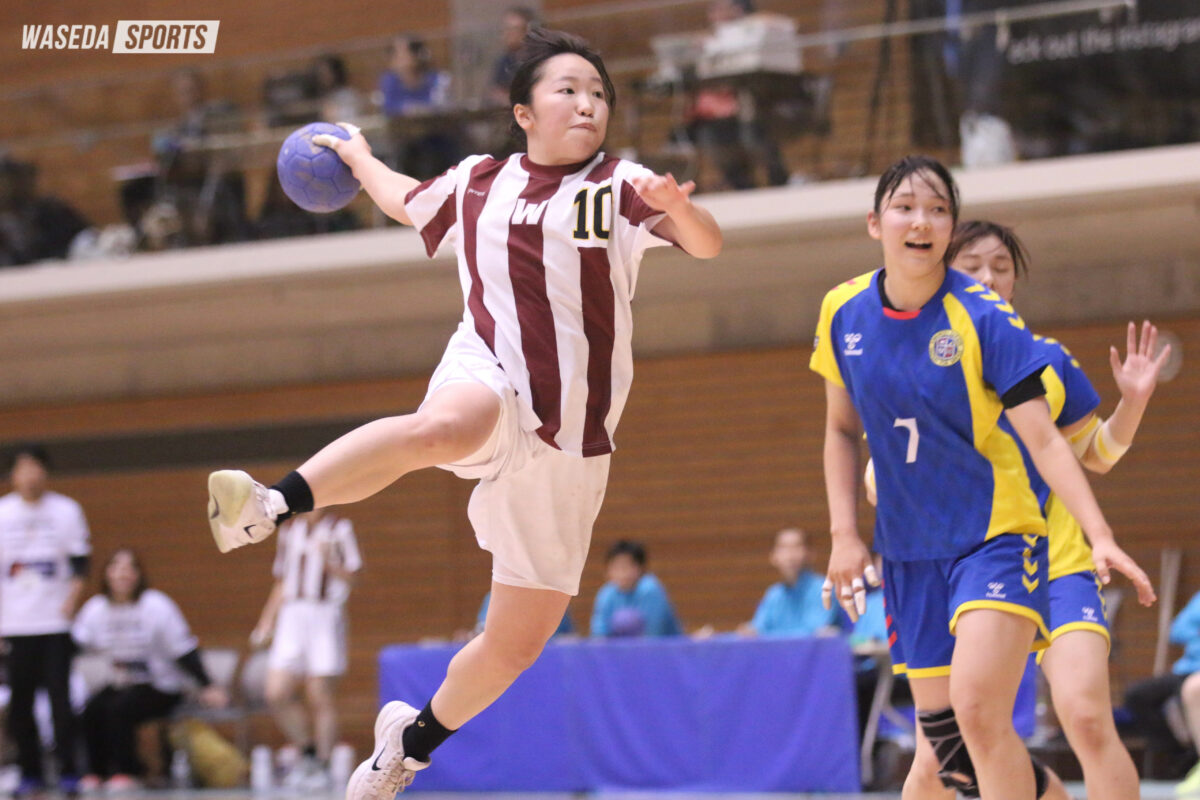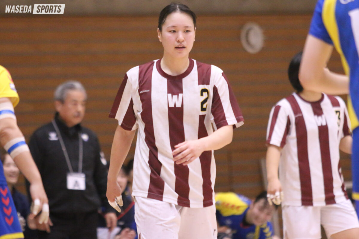 早大オフェンスで試合開始。直後には、倉持愛泉(スポ1=千葉・昭和学院)が自ら相手ディフェンスを割りミドルシュートを打ち込むが、先制とはならなかった。攻めあぐねる時間が続き、なんとかシュートに持ち込むものの、何度も相手GKに阻止されてしまう。開始から8分、ついに倉持のシュートが決まると、その後はスピード感のあるパスで相手ディフェンスの隙をつき、杉浦亜優主将(スポ4=愛知・名経大市邨)がポストシュートを決める。ディフェンスでも動きを止めず、相手のミスを誘うとそのまま速攻に持ち込み、井橋萌奈(スポ3=東京・白梅学園)と杉浦がそれぞれ得点。ロースコアな展開ながらも、早大が徐々に流れをつかみ始めた。また、GK作本夕莉(スポ3=福岡・明光学園)がこの日も股下のシュートなどを次々と止め、チームを救った。さらに積極的なオフェンスで7メートルスローなどでチャンスを手繰り寄せたが、関学大も黙ってはいない。前半終了間際にはサイドシュートを中心に相手に5連続得点を許し、8ー12で前半を終えた。