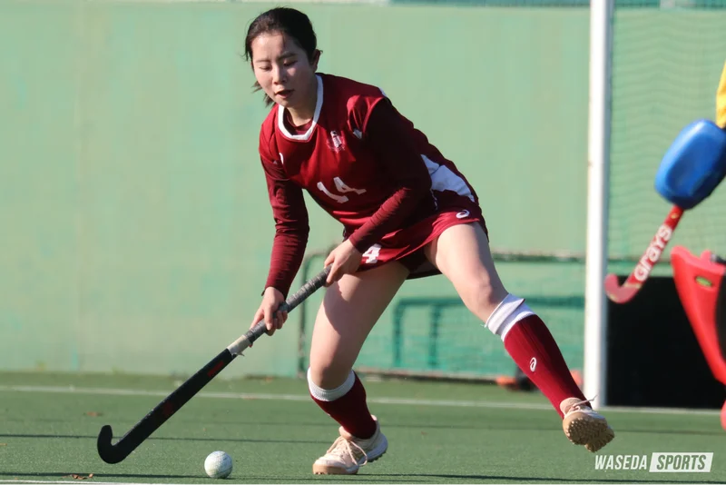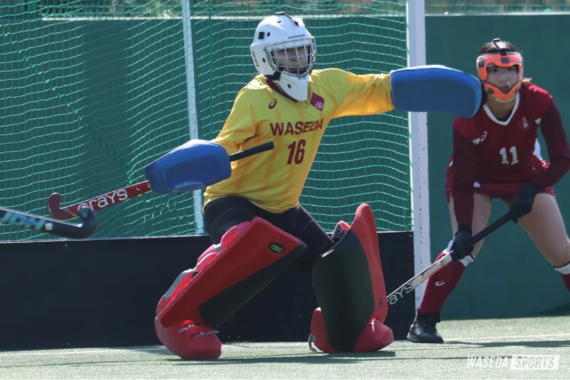 序盤から山梨学院大の圧倒的なボール支配力に翻弄(ほんろう)された早大。1Q4分、5分に立て続けにペナルティーコーナー(PC)を許したが、これはどちらもGK坂本の好セーブにより得点を許さない。しかし1Q終盤に差し掛かった11分に山梨学院大に押し切られて初失点、さらに終了間際にも追加点を許して2点を先制されてしまった。2Qに入ってもなかなか敵陣に踏み込むことはできず、ひたすらに守り続ける時間が続いた早大。得点のチャンスはなかなかつかむことが出来なかったが、このQはGK坂本をはじめとしてチーム全員が徹底的な守備を敷き、無失点でしのぐことに成功した。2点を追いかける早大は後半での逆転を信じ、ハーフタイムを迎える。