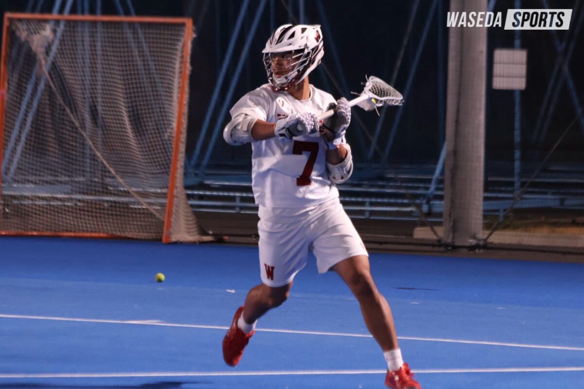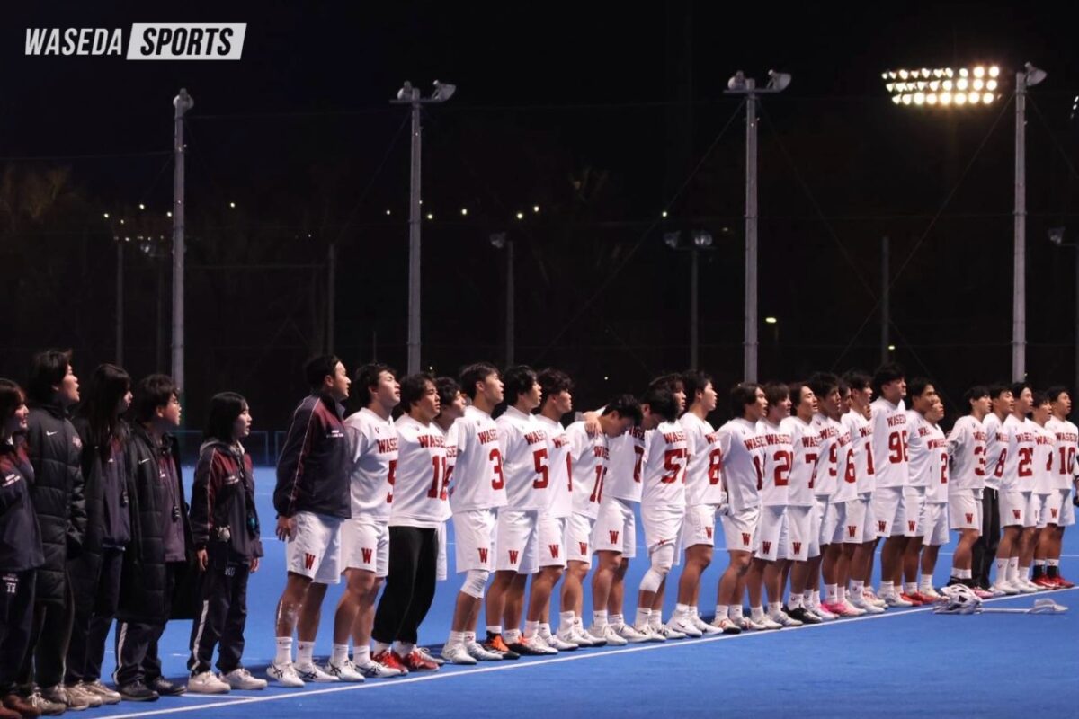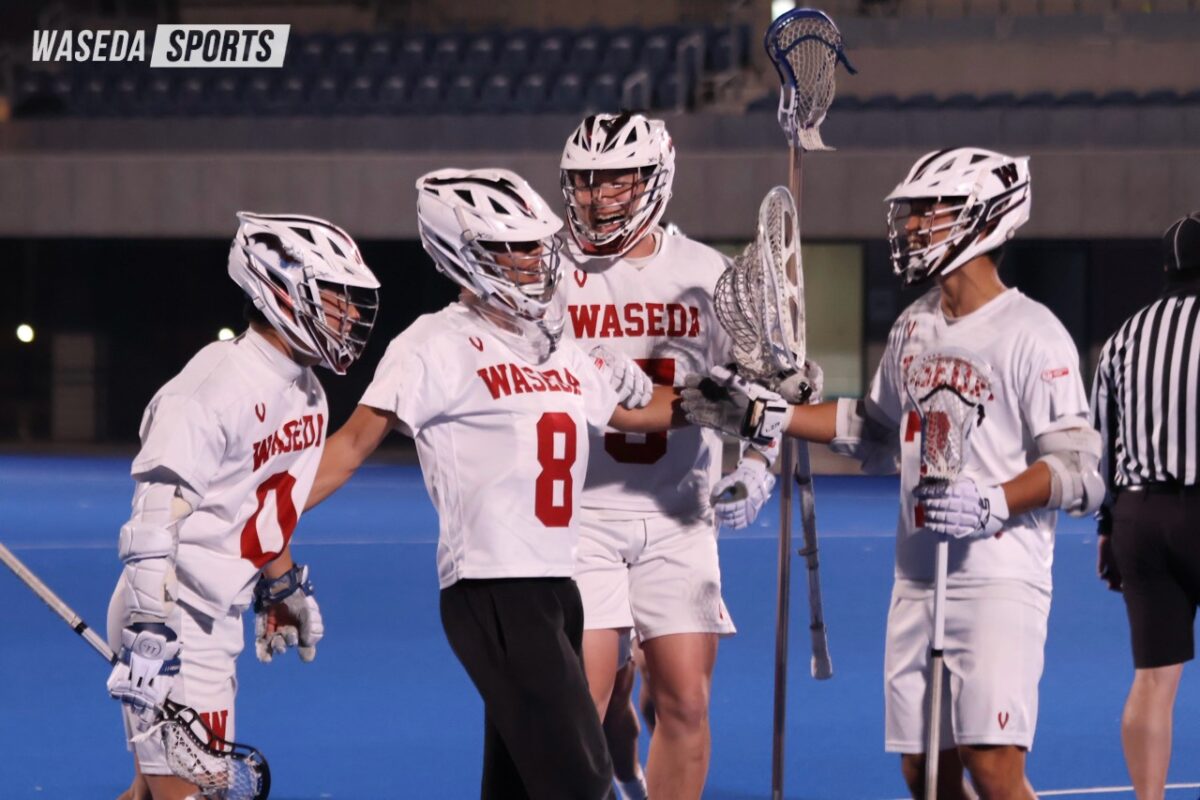 第1Q最初のフェイスオフは立大が勝ち切ると、試合開始数秒で立大に先制点を決められてしまう。早大はマンダウンののち2点目を奪われるとその後も相手の攻撃に翻弄され、立大が試合の主導権を握る展開が続く。早大はグラウンドボールをすくい取れず、ポゼッションを安定させることができない。相手の勢いに押され、0-3で第1Qを終える。第2Qに入り、最初のフェイスオフから主導権を握り直すと、AT吉田宗一郎(教育4=東京・早実)のパスを受けたAT進藤洸翔(国教4=東京都市大附属)がゴールネットを揺らし1点を返す。続いてMF井原主将が追加点を挙げると、主将の一撃に観客席はこの日1番の盛り上がりを見せ、試合の流れを一気に引き寄せる。勢いに乗る早大はAT吉田の得点で同点に追いつくと、自陣から敵陣まで駆け抜けたSSDM成瀬壮真(商3=東京・早実)のフィードを受けたMF吉原悠真(スポ4=神奈川・桐蔭学園)が勝ち越しのゴールを決め、1点のリードで前半を折り返す。
