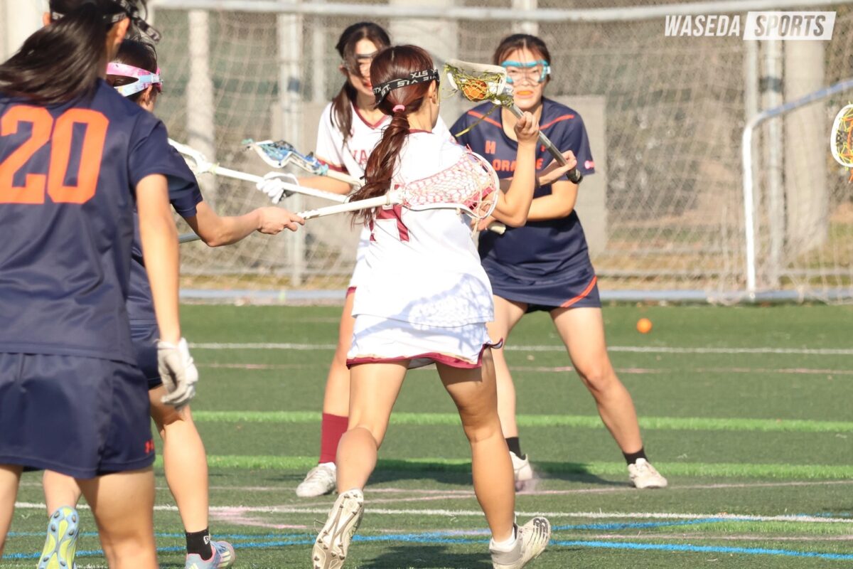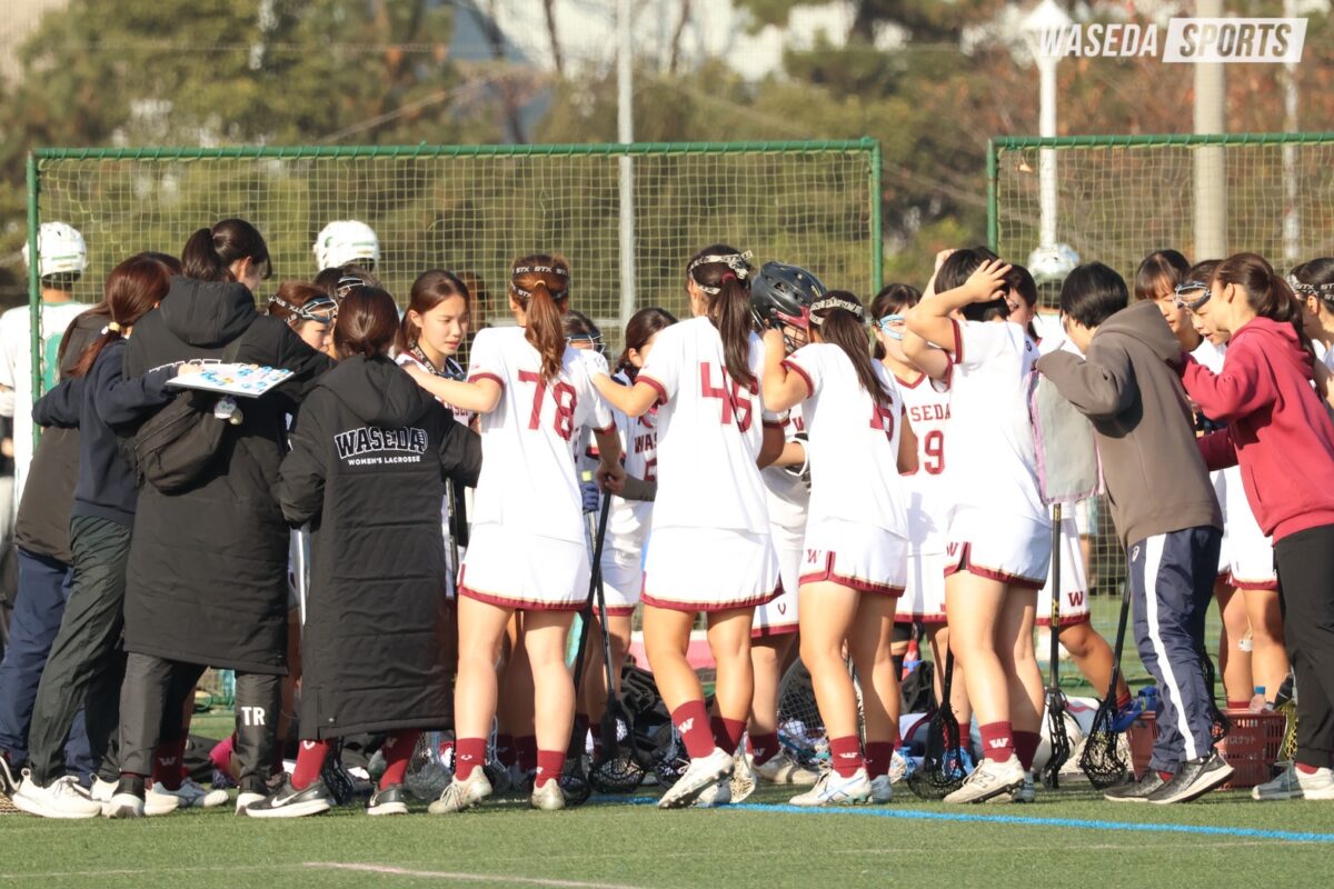 準々決勝では、法大・学芸大の連合チームと対戦。先制点を許したものの、4分に須永万尋(国教1=東京農大第一)が1on1からのショットを沈め、試合を振り出しに戻す。しかし直後に再び失点し、追う展開となった。それでも安達理央菜(教1=Palos Verdes High School)、村本詩桜(創理1=埼玉・早大本庄)が獲得したフリーシュートをそれぞれ自ら決め切り、3-2と逆転して第1Qを終える。続く第2Qは互いに譲らず、得点が生まれない時間帯が続いた。4分、相手のゴール前での攻撃にDF陣が食らいつくも、わずかな隙を突かれ同点弾を許す。それでも6分、渡邉百音(スポ1=神奈川・横須賀)から安達へのパスが通ると、安達がゴール右からショットを放ち勝ち越しに成功。この1点を守り切り、4-3で勝利を収め、準決勝進出を決めた。