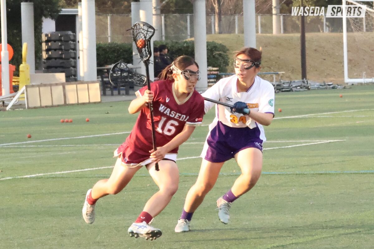 続く3位決定戦では、明大と対戦した。早大は勝利を目指し、気持ちを切り替えて試合に臨んだ。試合は序盤から拮抗した展開となる。開始のドローを奪われると明大の攻撃が続き、2分、ゴール裏から仕掛けられるとゴール右上へのショットで先制点を許した。その後、両者がフリーシュートを獲得するなど攻撃の機会を迎えるも、得点にはつながらず。0-1で第1Qを終えた。続く第2Qは早大の攻撃から幕を開ける。渡邉がフリーシュートを獲得すると、バウンドショットを沈め、1-1の同点に追いついた。しかし5分、再び明大に勝ち越し点を許す。それでもゴーリーの好セーブで追加点を防ぎ、反撃の機会を伺う早大。試合終了間際に、石井愛莉(スポ1=神奈川・平塚中等教育学校)が放った鋭いショットがネットを揺らし、土壇場で同点に追いつくと、試合を延長戦に持ち込んだ。延長戦では早大が攻勢を強めたものの、決め切ることができない。すると相手ボールとなったラスト30秒、明大に得点を許し、2-3で惜しくも敗戦した。