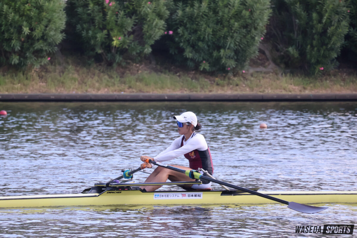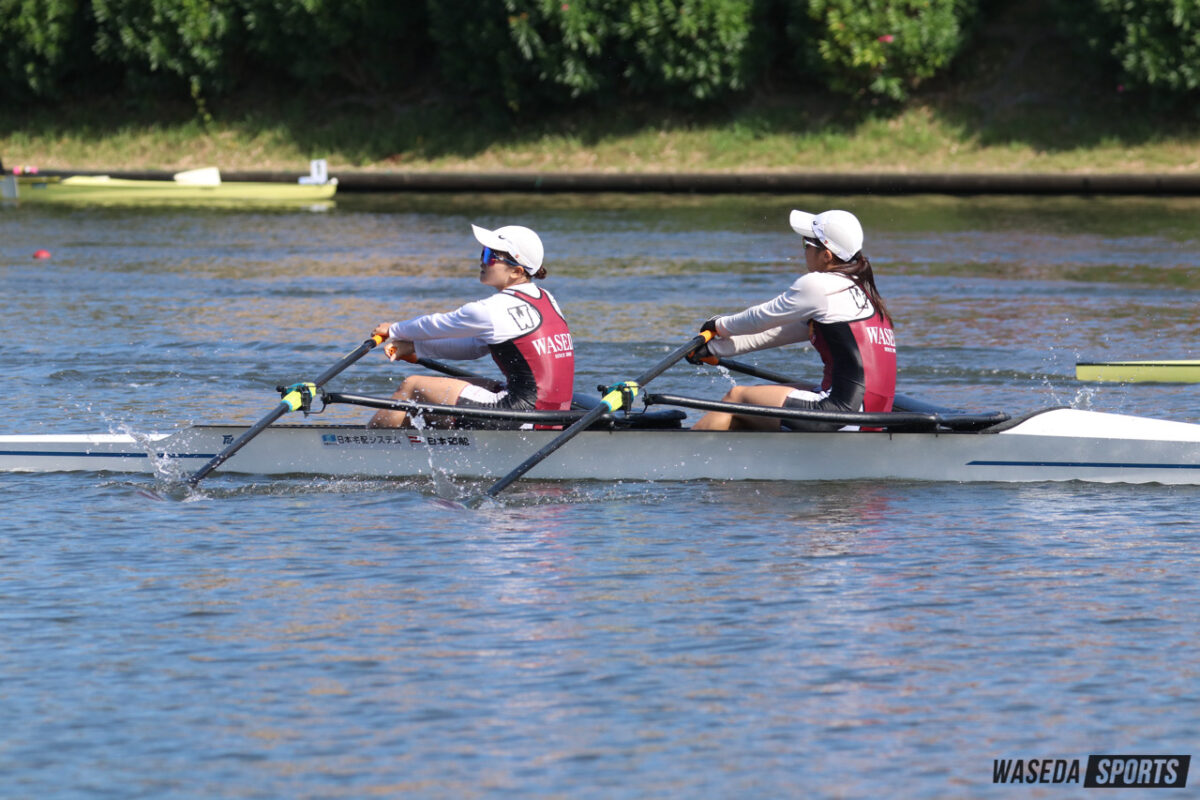 総合優勝を目標に掲げてきた女子からは、舵手付きフォア、ペア、ダブルスカル、シングルスカル、エイトの5種目が出場。準決勝では全種目で上位フィニッシュを果たし、A決勝に駒を進めた。大会最終日、初陣を切ったのは舵手付きフォア。500メートル地点まではほぼ横並びの展開となるも、徐々に立命館大、立大に水をあけられる。やがて慶大にも先行を許し、表彰台争いには絡めず4着でフィニッシュした。ペアでは、序盤につけられた差を詰められず、6着でレースを終えた。前回大会優勝のダブルスカルでは、「スタートから攻める」(加藤真奈女子主将、スポ4=静岡・浜松西)の言葉通り、勢いよく飛び出し、差はわずかながら先頭を走る。しかし中盤に入ると同志社大に並ばれ、さらに富山国際大、立命館大も加わって4艇での優勝争いに。得意の終盤の粘りで抜け出したい早大だったが、最後は富山国際大の猛スパートに屈するなどして3着フィニッシュ。健闘しつつも悔しさが残る結果となった。シングルスカルでは緒方美奈(スポ3=熊本学園大付)が出場。レースは序盤で明大の兼松が抜け出し、4名での2着争いに。1000メートル地点で緒方が前に出て後続との差を広げ、そのまま安定した漕ぎで2位入賞を果たした。女子の最終種目は、ほとんどの選手がダブルエントリーしたエイト。疲労もある中でまずまずのスタートを切り3番手につける。中盤から終盤にかけて差を詰めていったが、ラストで再び離され、3着でのゴールとなった。