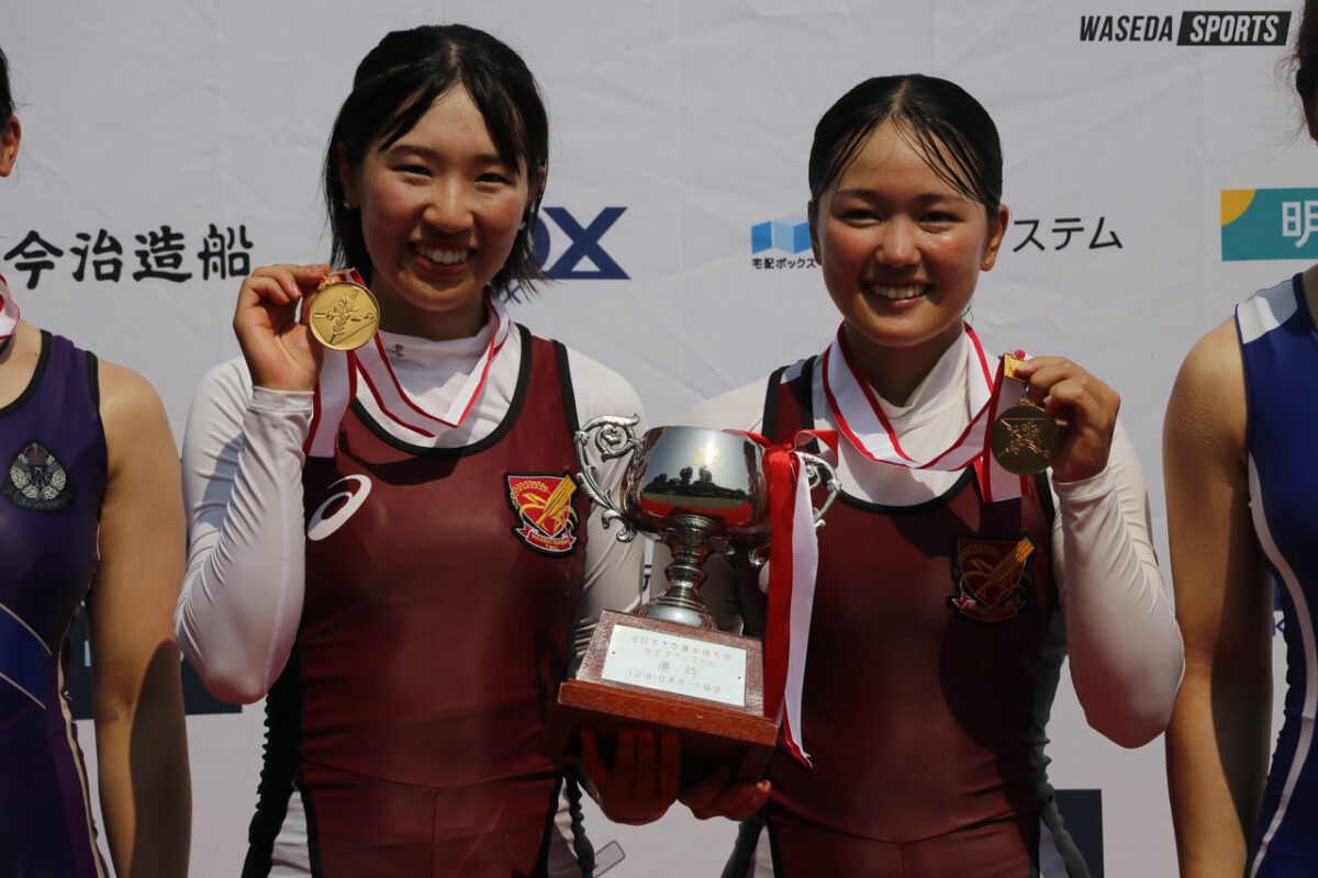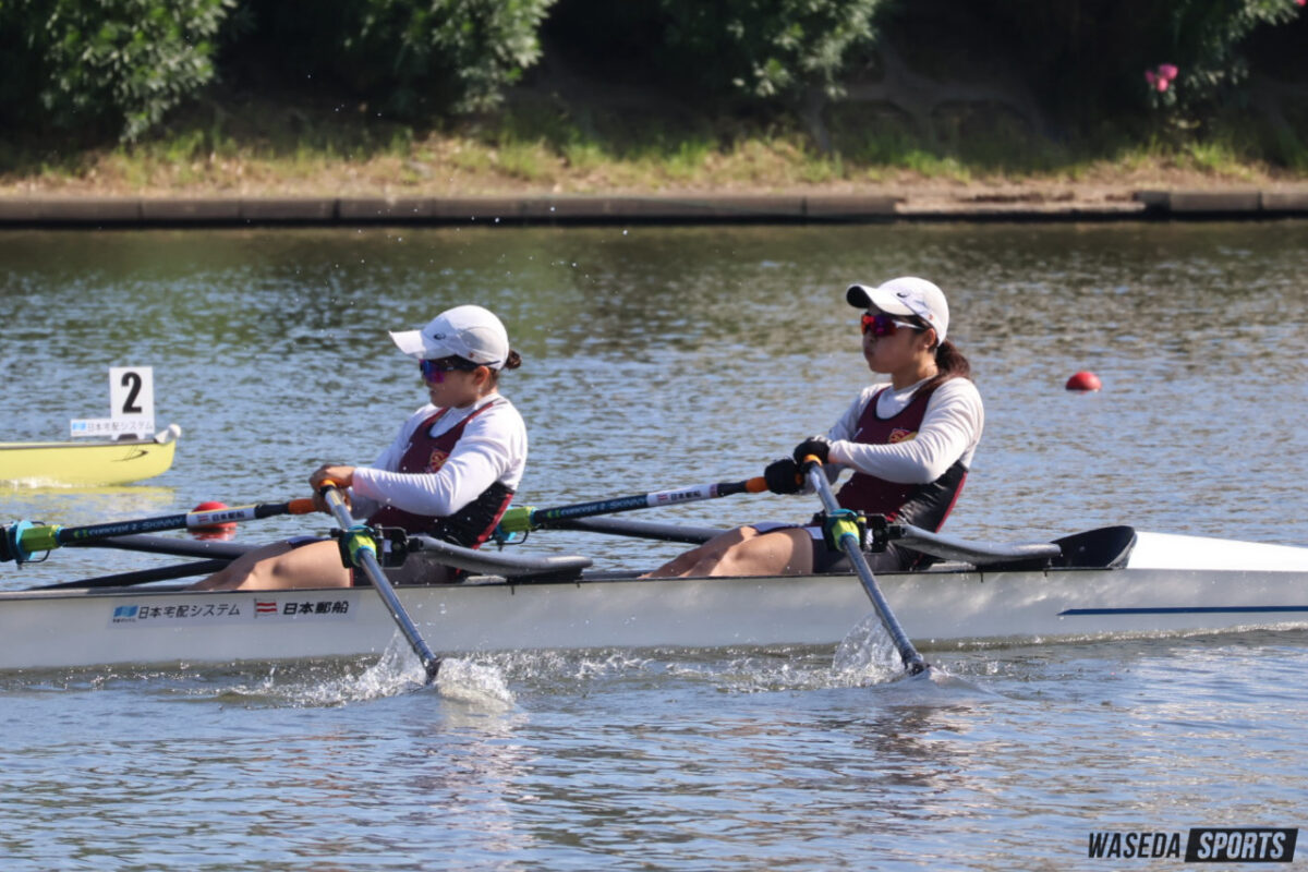 選手としての自信を携えて迎えた3年次は、「自分たちがチームを引っ張る側になったのを実感した」一年だったと振り返る。この年は当時主将の猪野日向子(令7スポ卒)とダブルスカルを組み、全日本選手権(全日本)とインカレを戦った。猪野が日本代表の活動で不在がちな中、二人での練習時間は限られていたが、互いの漕ぎのイメージを丹念に擦り合わせ、感覚を積み上げていった。全日本で3位、インカレで優勝と、この年も輝かしい成績を残した。