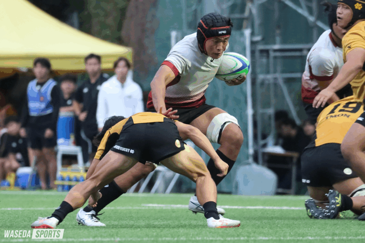 SO池山昂佑(商3=東京・早実)のキックで幕が開けた今試合。キックオフボールをFL多田陽道(商2=東京・早実)が好プレッシャーから直接キャッチし、華麗な試合の入りをみせた早大C。先制点は早くも2分。相手ゴールを目前としたマイボールスクラムでCTB菊川迪(スポ2=兵庫・報徳学園)が力強いキャリーから前進し、起点を作る。するとSH渡邊晃樹(スポ2=神奈川・桐蔭学園)がラックサイドのギャップを見逃さず飛びこんだ。池山のゴールも決まり7ー0とする。ここからは早大Cが攻撃の時間を長く握るも、ハンドリングエラーが重なり得点には至らない。それでも守備から積極的にプレッシャーをかけ、ディフェンスを起点として果敢に前へと攻め込んでいった。16分、菊川が鋭い出足のディフェンスから相手を仕留め、反則を誘う。池山のキックから敵陣ゴール前まで進む。ラインアウトモールから渡邊から池山、菊川、FB高栁壮史(創理4=東京・早大学院)までボールをつなぐと、最後はWTB小澤ジョージィ(スポ4=千葉・流経大柏)がグラウンディングし、12ー0。30分には、高栁がライン際でビッグゲインを切ると渡邊が素早く捌き、池山がスペースにボールを運ぶ。菊川が相手ディフェンスをずらしながら前進し、そのままゴールラインを叩き割った。一時は慶大Cに細かいパスをつながれ、ゴール前まで攻め込まれるピンチの場面もあったが、ディフェンスでも15人でつながり続けた早大Cはスティールに成功し、凌ぎ切る。37分にはラインアウトモールからHO野口大雅(文構3=東京・早実)、そして40分にはキックパスを受け取った小澤ジが得点を奪う。31ー0として前半を終えた。