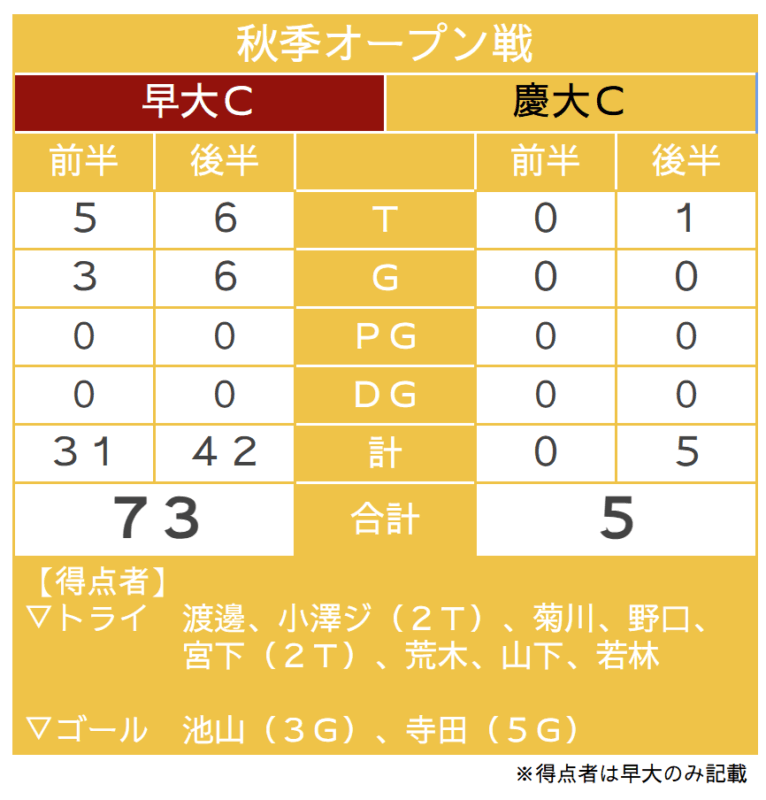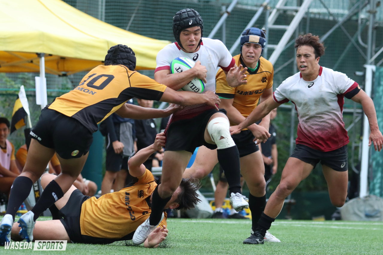 今試合で大量得点を挙げた早大C。大幅なメンバー交代後も攻撃のクオリティーを落とさなかった点は、大きな収穫と言える。そして、その中でも強い存在感を放ったのが渡邉と菊川だ。渡邉はテンポの速い球捌きでスペースへとボールを運び、チームの攻撃を巧みにコントロール。菊川は攻守両面で体を張り続けた。攻撃では鋭いヒットでゲインラインを突破してトライの起点となり、守備では素早い出足から鋭いタックルを決め、慶大Cの攻撃の芽を摘み取った。そして今試合は『One Shot』を体現した試合でもあるだろう。早大Cは敵陣22メートルラインに入るたびに確実にトライを奪い切り、堂々と自陣へと戻っていった。シーズンが深まるにつれてカテゴリーをあげる機会は限られていく。しかし、今試合でチャンスをつかみ取った彼らは、これからもその好機をつかみとっていくだろう。