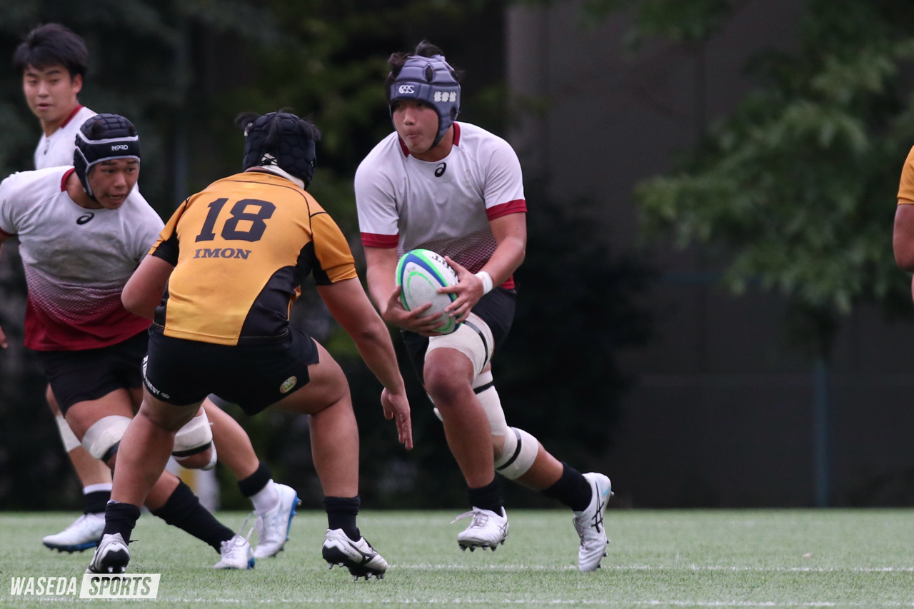 SO池山昂佑(商3=東京・早実)のキックで幕が開けた今試合。キックオフボールをFL多田陽道(商2=東京・早実)が好プレッシャーから直接キャッチし、華麗な試合の入りをみせた早大C。先制点は早くも2分。相手ゴールを目前としたマイボールスクラムでCTB菊川迪(スポ2=兵庫・報徳学園)が力強いキャリーから前進し、起点を作る。するとSH渡邊晃樹(スポ2=神奈川・桐蔭学園)がラックサイドのギャップを見逃さず飛びこんだ。池山のゴールも決まり7ー0とする。ここからは早大Cが攻撃の時間を長く握るも、ハンドリングエラーが重なり得点には至らない。それでも守備から積極的にプレッシャーをかけ、ディフェンスを起点として果敢に前へと攻め込んでいった。16分、菊川が鋭い出足のディフェンスから相手を仕留め、反則を誘う。池山のキックから敵陣ゴール前まで進む。ラインアウトモールから渡邊から池山、菊川、FB高栁壮史(創理4=東京・早大学院)までボールをつなぐと、最後はWTB小澤ジョージィ(スポ4=千葉・流経大柏)がグラウンディングし、12ー0。30分には、高栁がライン際でビッグゲインを切ると渡邊が素早く捌き、池山がスペースにボールを運ぶ。菊川が相手ディフェンスをずらしながら前進し、そのままゴールラインを叩き割った。一時は慶大Cに細かいパスをつながれ、ゴール前まで攻め込まれるピンチの場面もあったが、ディフェンスでも15人でつながり続けた早大Cはスティールに成功し、凌ぎ切る。37分にはラインアウトモールからHO野口大雅(文構3=東京・早実)、そして40分にはキックパスを受け取った小澤ジが得点を奪う。31ー0として前半を終えた。